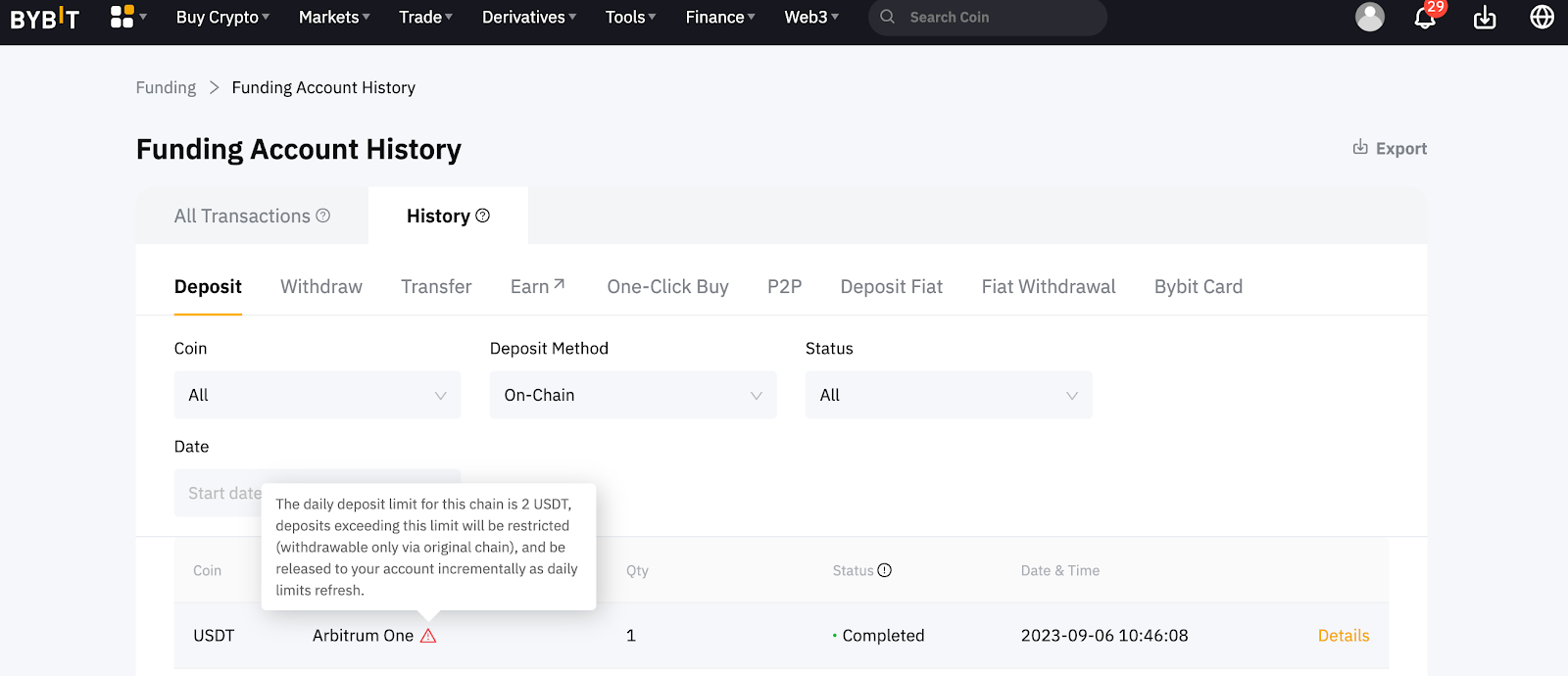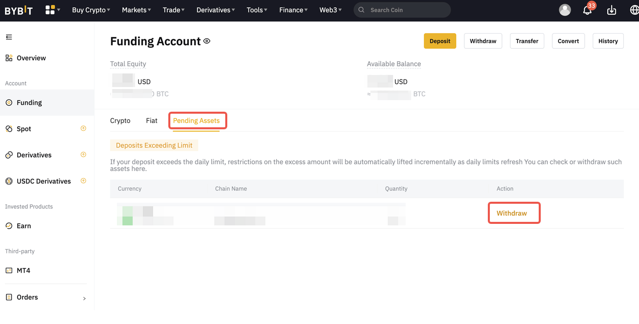 وقد وضعت Bybit حدًا ائتمانيًا للإيداع اليومي لكل بلوكشين معين. ستبقى الإيداعات التي تتجاوز هذا الحد مؤقتًا كأصول غير قابلة للتداول، ويمكن الاطلاع عليها في قسم الأصول المعلقة في صفحة حساب التمويل