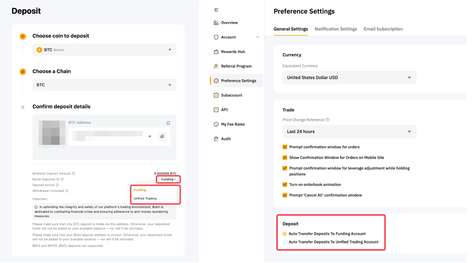 الإعداد الافتراضي هو حساب التمويل. ولكن يمكنك تغيير وجهة الإيداع إلى حساب التداول الموحد الخاص بك على صفحة الإيداع أو صفحة الإعدادات.