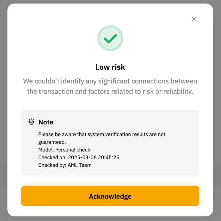 من خلال إدخال عنوان المحفظة واختيار نوع البلوك تشين، سيقوم النظام بتقييم مستوى المخاطرة بالنسبة لك. ولكن يُرجى ملاحظة أن نتائج التحقق من النظام غير مضمونة بسبب بيانات البلوك تشين التي قد تكون قديمة أو عرضة لتهديدات متطورة.
