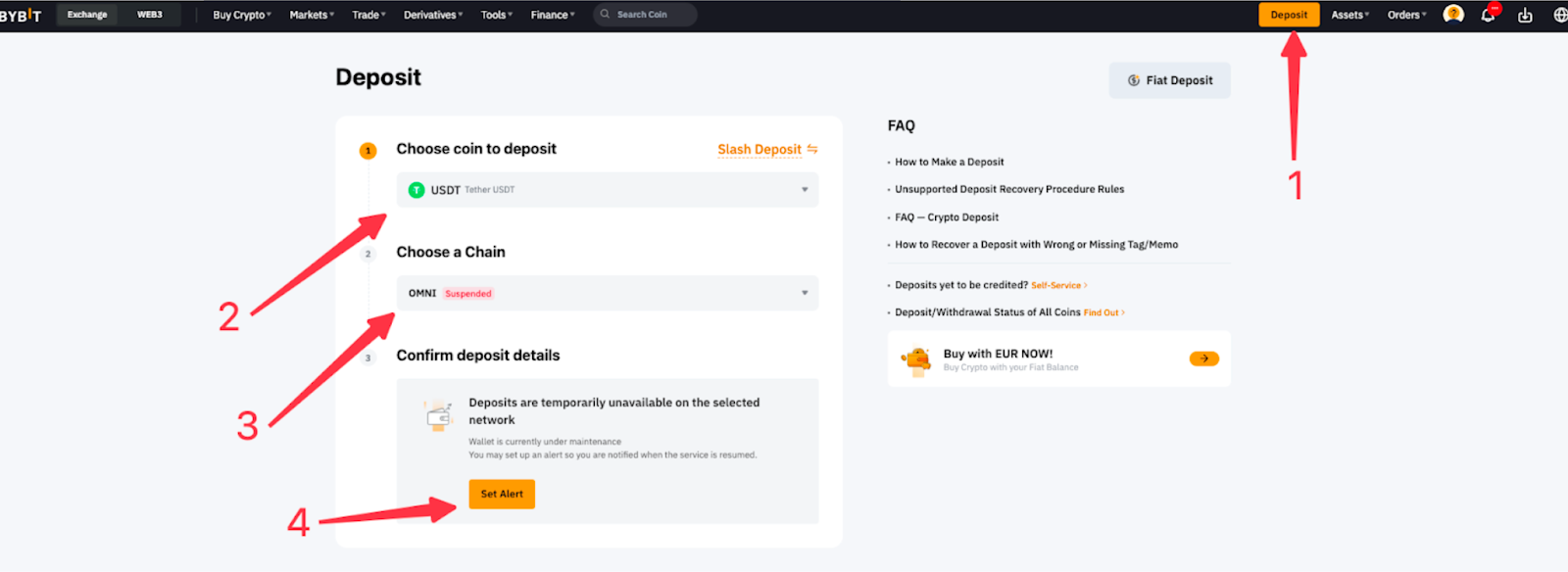 يمكنك أيضًا تحديد موقع مدخل الإيداع في الزاوية اليمنى العليا من صفحة Bybit.
