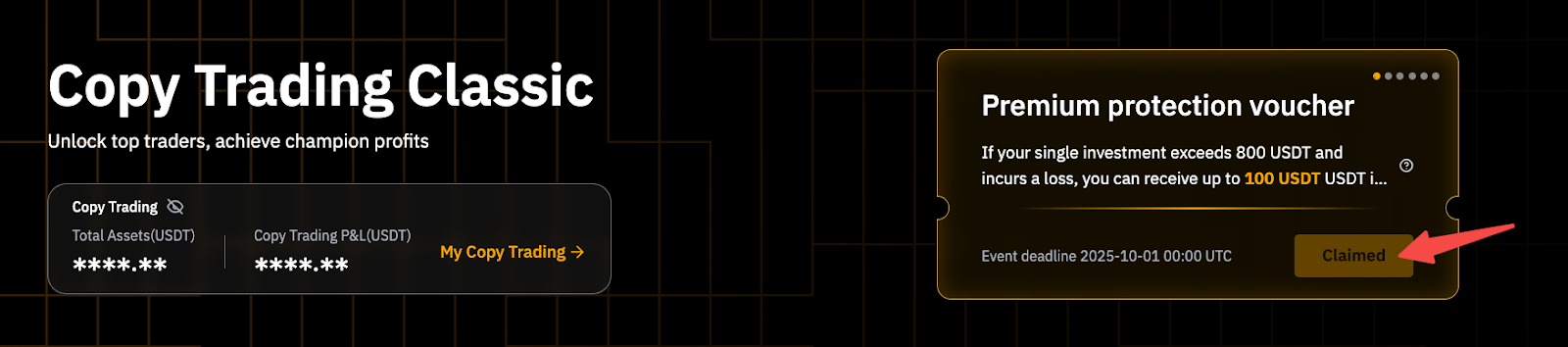 - قسيمة الحماية المميزة: يمكن المطالبة بها مرة واحدة كل ربع سنة في الزاوية اليمنى العليا من التداول بنسخ الكلاسيكي أو تداول TradFi. خلال نفس الربع، أنت مؤهل للحصول على تعويض يصل إلى 100 USDT عن الخسائر الناتجة عن تاجر محترف مؤهل واحد. يمكن استخدام هذه الميزة مرة واحدة في كل ربع.