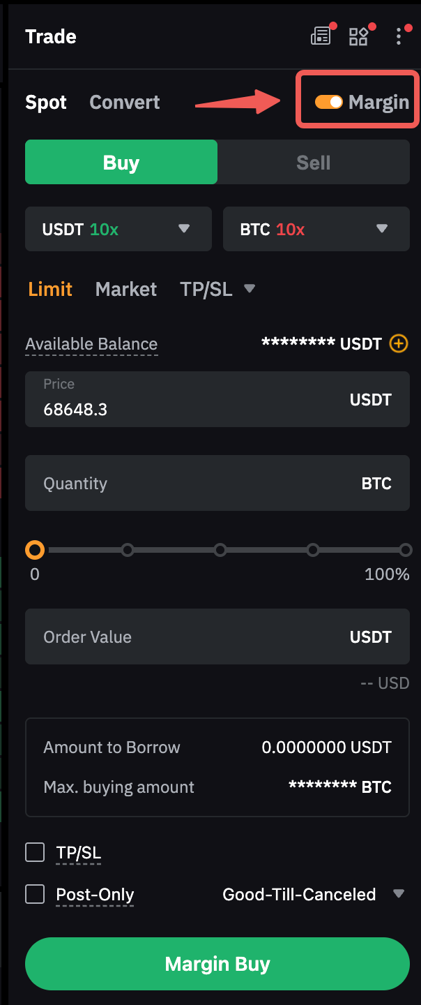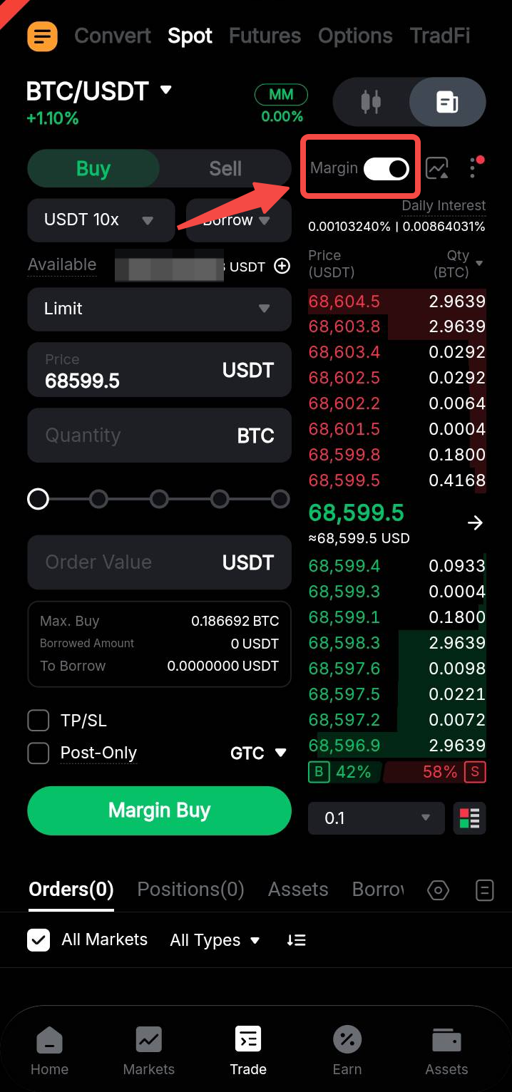 نعم، يمكن اقتراض أموال للتداول في السوق الفورية من خلال ميزة التداول بالهامش الفوري تحت وضعية الهامش المتقاطع أو محفظة الهامش. يمكنك تفعيل هذا بالتبديل على زر الهامش في منطقة الأوامر.