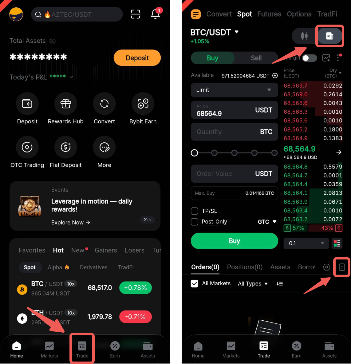 على تطبيق Bybit، اذهب إلى التداول → الفوري وقم بتبديل زر التداول للوصول إلى منطقة الطلبات. انقر على أيقونة تاريخ الطلبات في الزاوية اليمنى العليا من تبويب الموقف لعرض تاريخ الطلبات وتاريخ التداول الخاص بك.