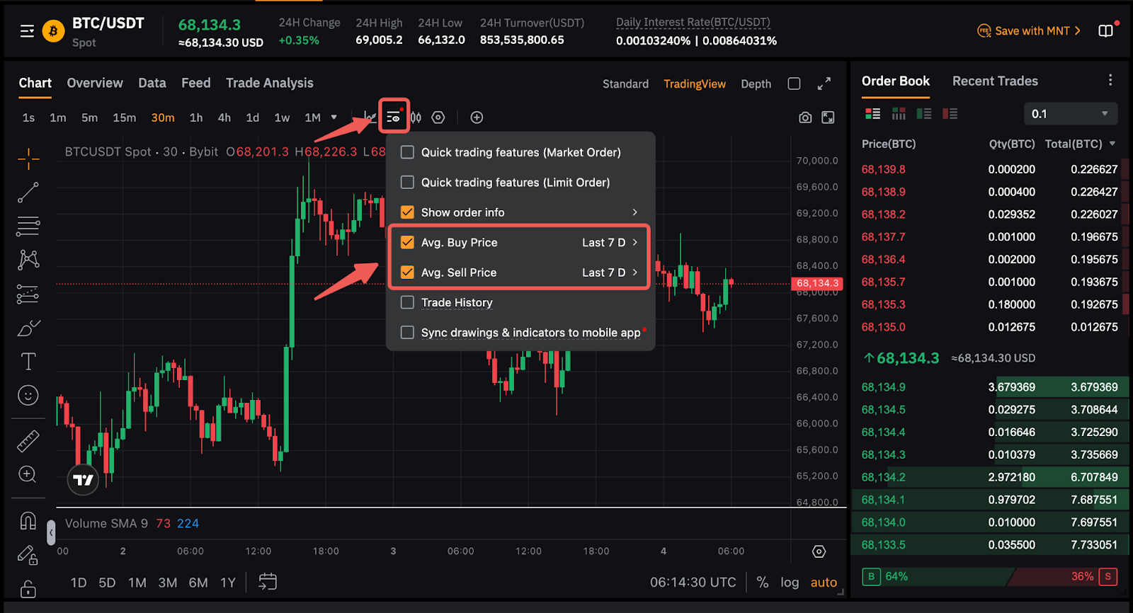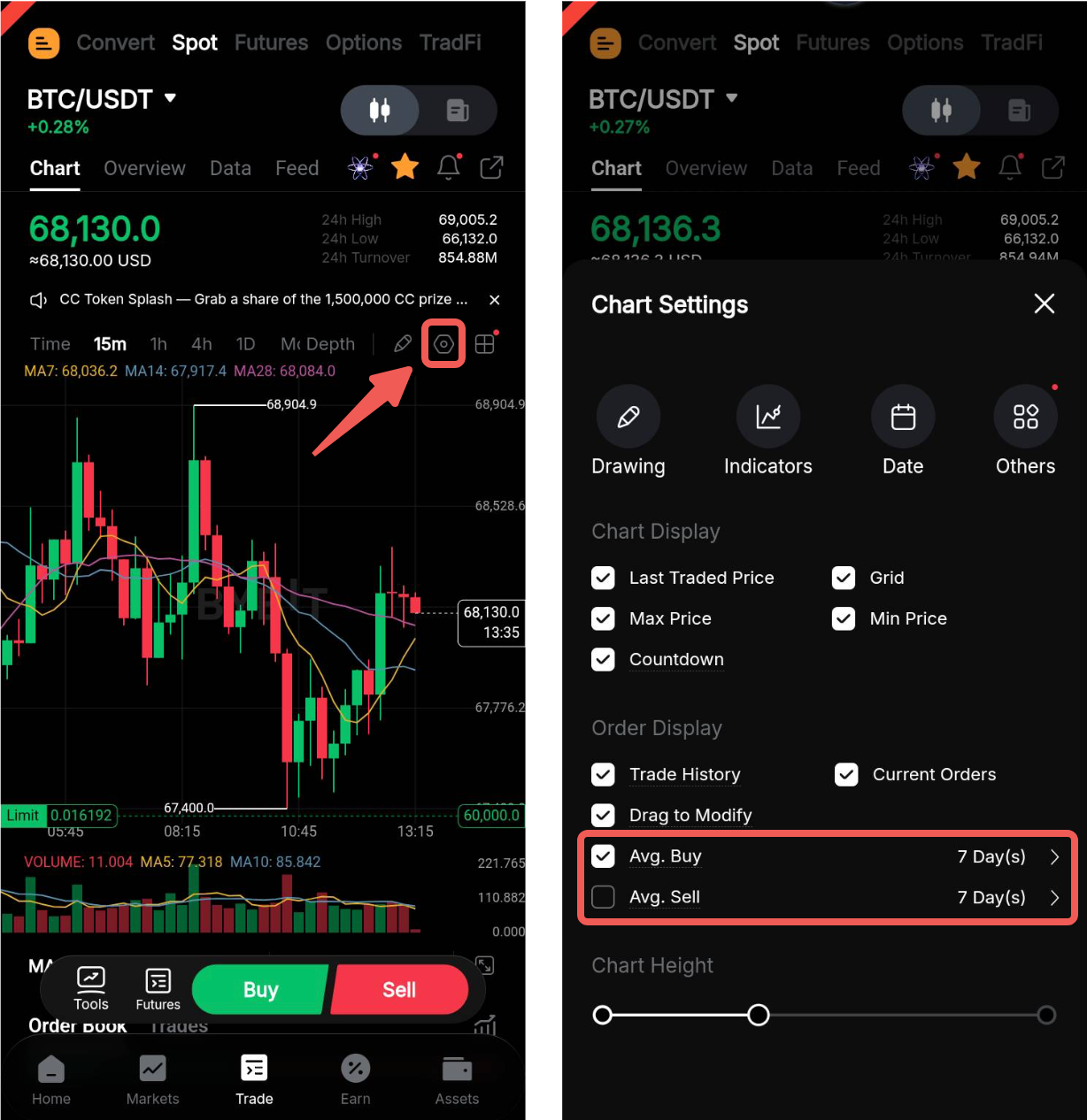 عند التداول في سوق الفورى، يمكنك عرض متوسط أسعار أوامر البيع والشراء مباشرة على الرسم البياني للتداول. لتفعيله، قم بالنقر على أيقونة العرض وضع علامة اختيار على متوسط السعر الذي ترغب في رؤيته. كما يمكنك تحديد الفترة التي سيتم بناءً عليها حساب المتوسط (آخر 7، 30، 60، أو 90 يوماً). يرجى ملاحظة أن السعر المتوسط سيتم حسابه من اليوم الحالي إلى آخر يوم في الفترة المختارة.