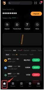 الخطوة 1: قم بتشغيل تطبيق Bybit. في الزاوية السفلية اليسرى، اختر الرئيسية.