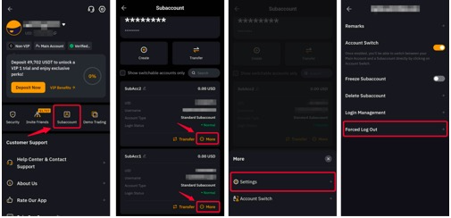 عند تسجيل الدخول عبر صفحة الدخول الخاصة بـ Bybit، يمكنك تسجيل الخروج من حسابك الفرعي بالنقر على صورة الملف الشخصي في الصفحة الرئيسية، وفتح صفحة الإعدادات والتمرير إلى نهاية القائمة للنقر على زر تسجيل الخروج.
