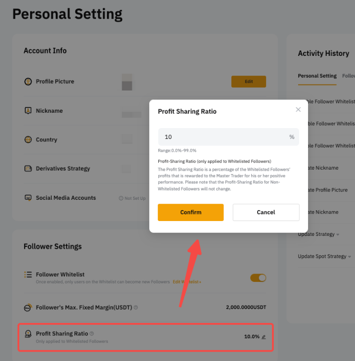 - يمكنك تحديد نسبة مشاركة الأرباح بين 0% و 50%. سيتم تطبيق أي تغييرات على جميع المتابعين.