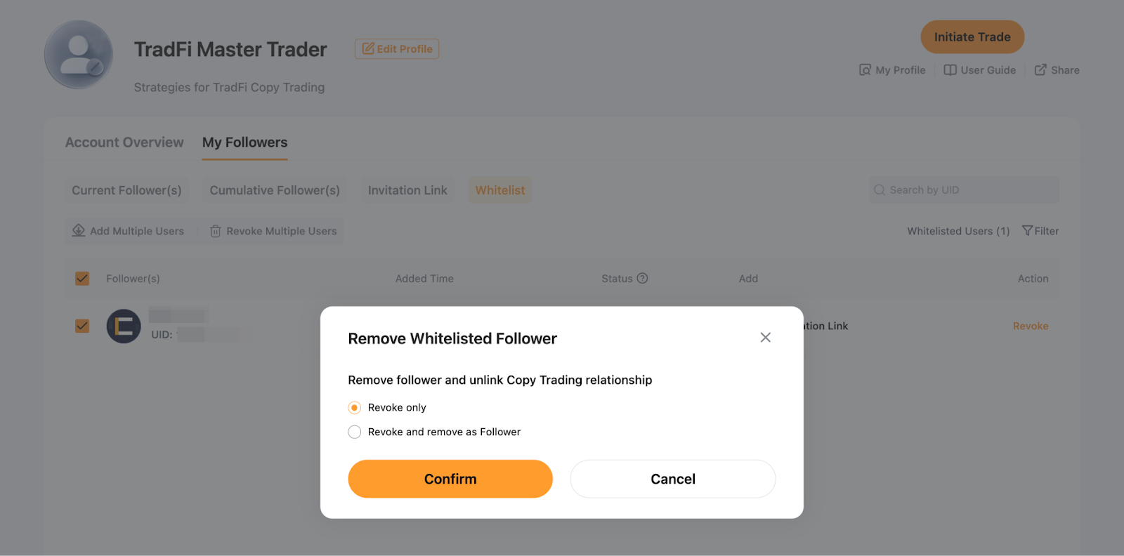 - الإلغاء فقط: إزالة المستخدم من قائمتك البيضاء مع السماح لهم بمواصلة نسخ التداولات الحالية حتى يقوموا بإلغاء المتابعة. بمجرد أن يقوموا بإلغاء المتابعة، لن يكون بمقدورهم متابعة تداولاتك إلا إذا تم إضافتهم مجددًا إلى القائمة البيضاء.