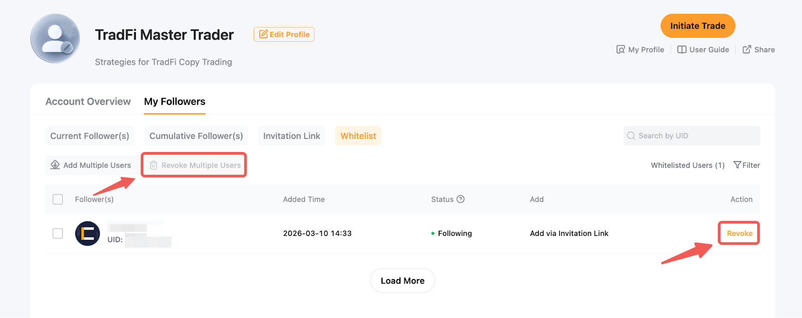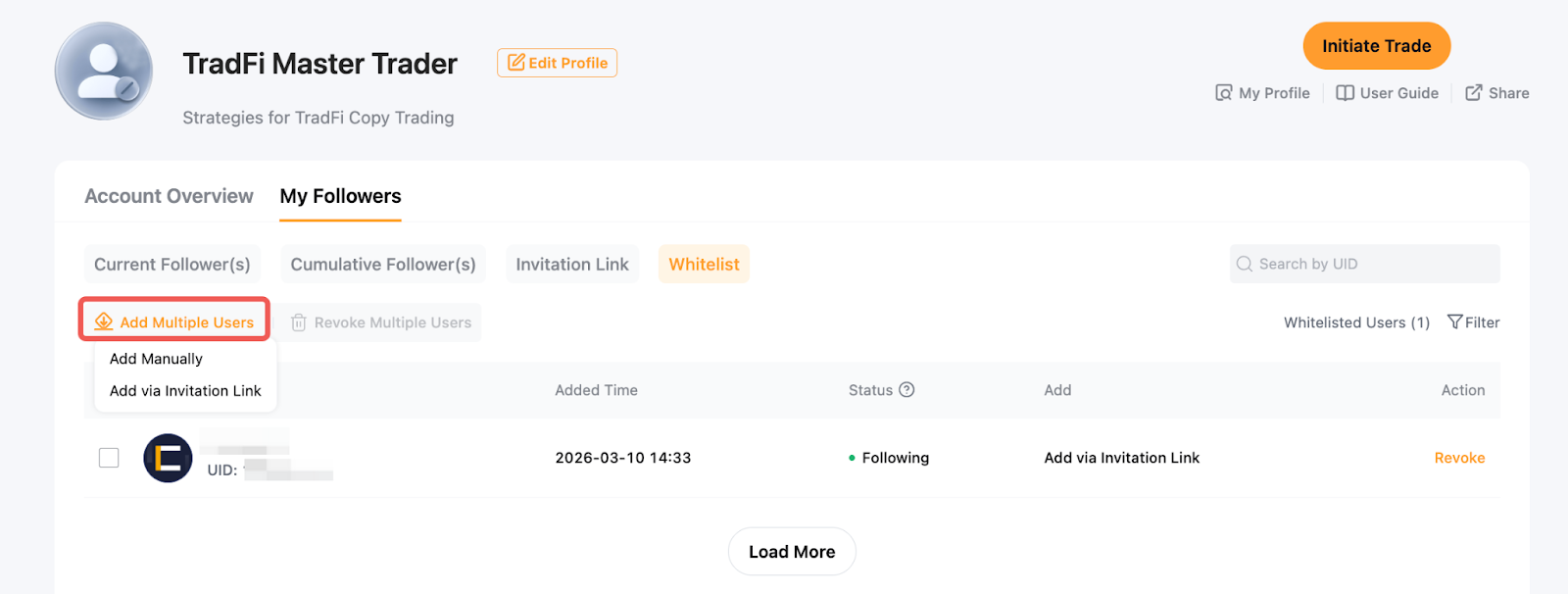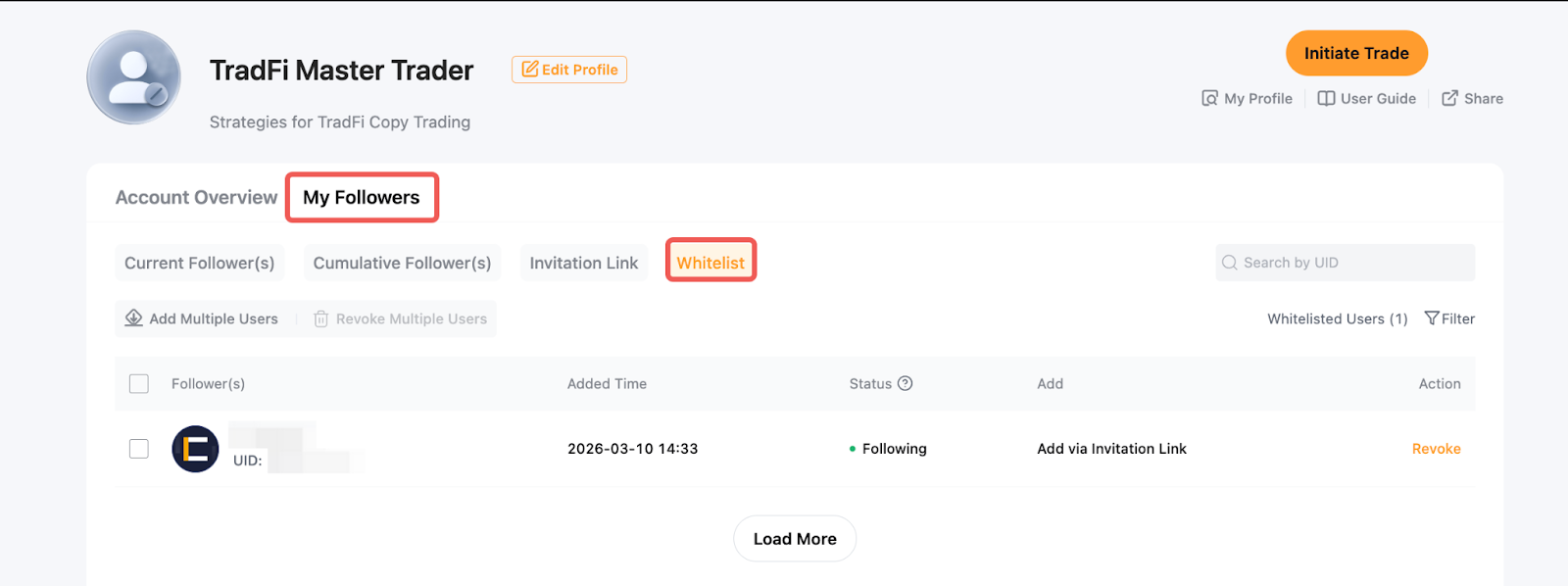 الخطوة 1: لإضافة المستخدمين المعتمدين، انتقل إلى مركز المستخدم (المتداول الرئيسي) → متابعيني → القائمة البيضاء.
