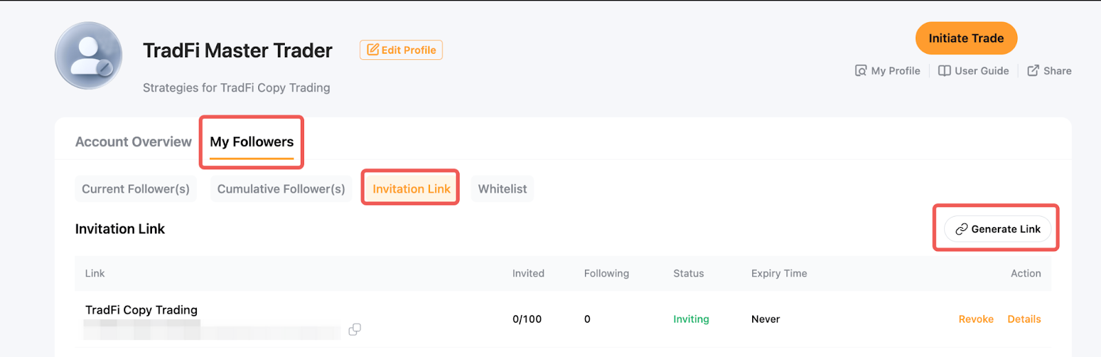 الخطوة 1: لإنشاء رابط دعوة، اذهب إلى مركز المستخدم (المتداول الرئيسي) → متابعيني → الدعوات، ثم انقر على توليد رابط.