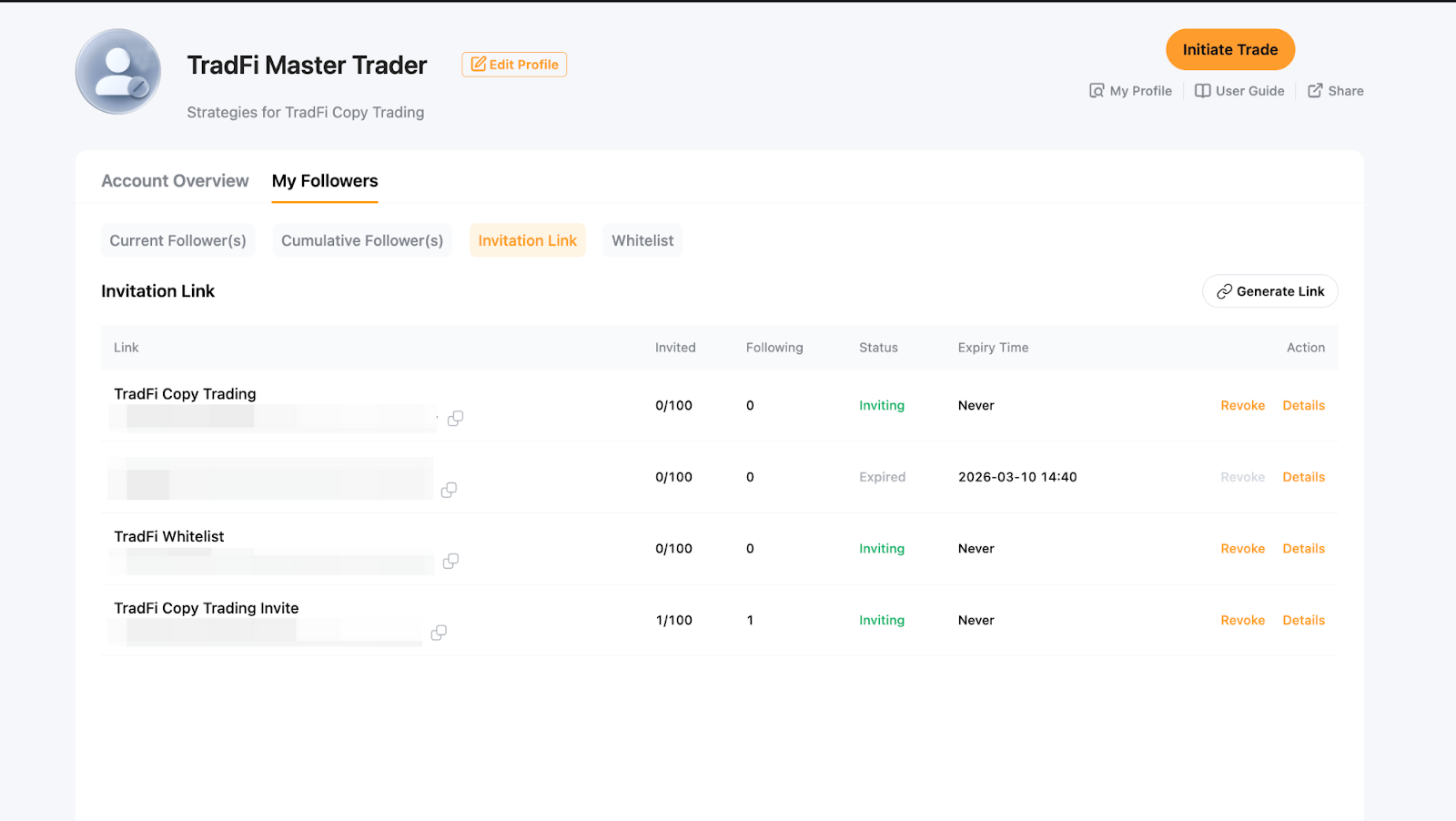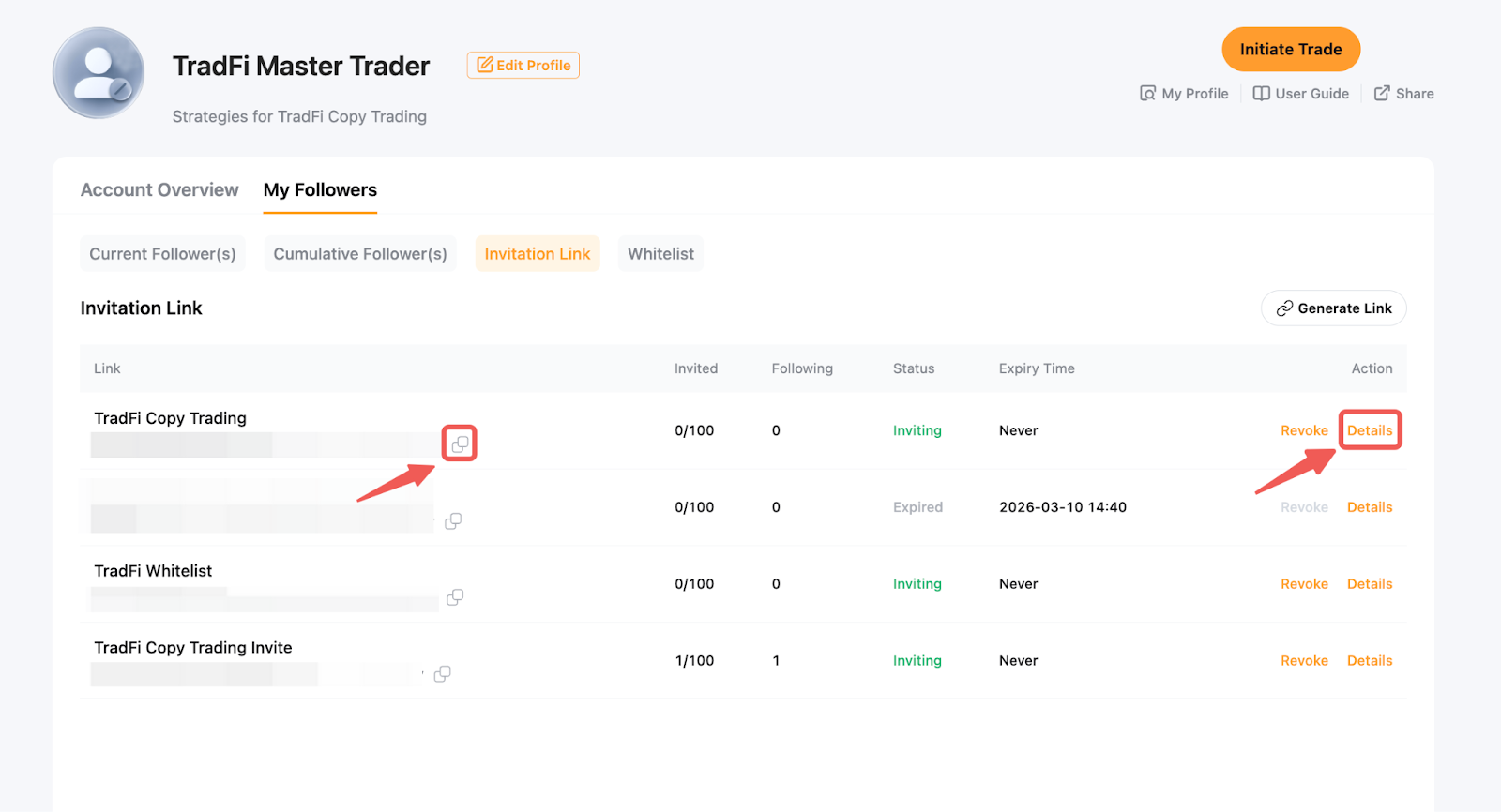 كمتداول رئيسي، يمكنك إنشاء رابط دعوة فريد يتيح للمتابعين نسخ تداولاتك مباشرة دون تأكيد إضافي. إذا كانت قائمة المتابعين البيضاء مفعلة، سيتم إضافة المتابعين الذين ينضمون عبر رابط الدعوة تلقائيًا إلى القائمة البيضاء.