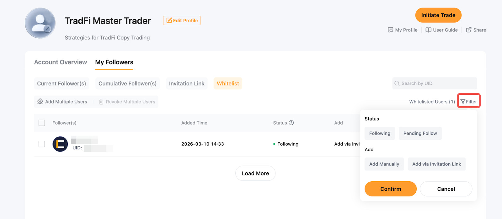 يقدم تداول النسخ TradFi ميزتين — رابط الدعوة وقائمة المتابعين البيضاء — التي تتيح للمتداولين الرئيسيين إدارة من يمكنه متابعة تداولاتهم.