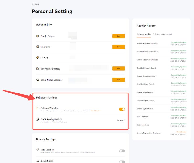 لتفعيل قائمة المتابعين البيضاء الخاصة بك، انتقل إلى مركز المستخدم (المتداول الرئيسي) → الإعدادات الشخصية → إعدادات المتابعين ، وقم بتبديل خيار قائمة المتابعين البيضاء .