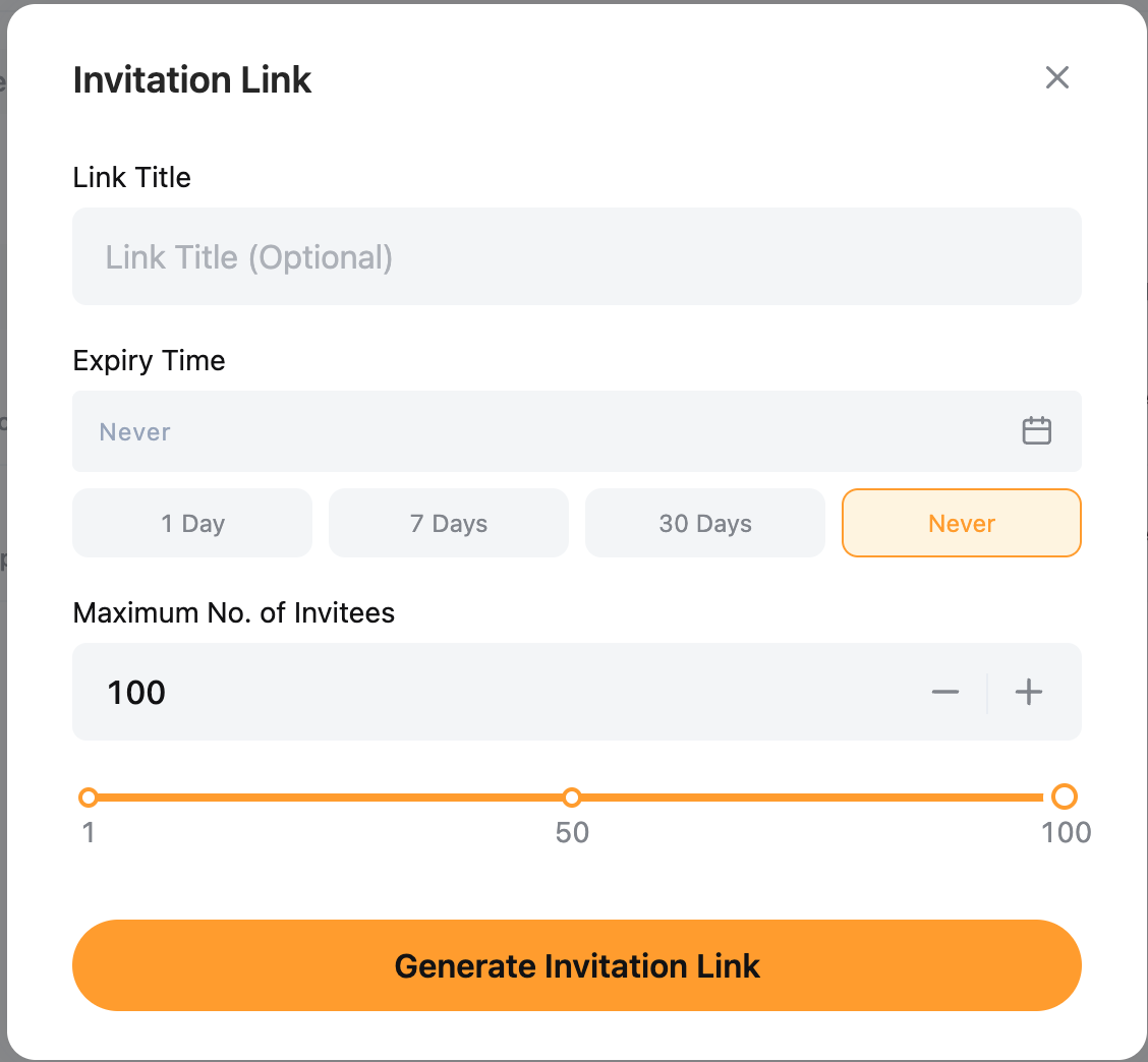 ملاحظة: إذا لم يتم التحديد أبدًا، فسيظل الرابط صالحًا حتى يتم الوصول إلى الحد الأقصى لعدد المدعوين.