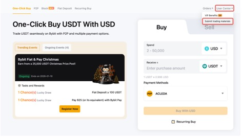 الخطوة 2: انقر على تقديم مواد التداول تحت مركز المستخدم في الزاوية اليمنى العليا من صفحة الشراء بنقرة واحدة.