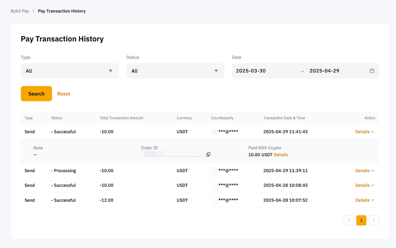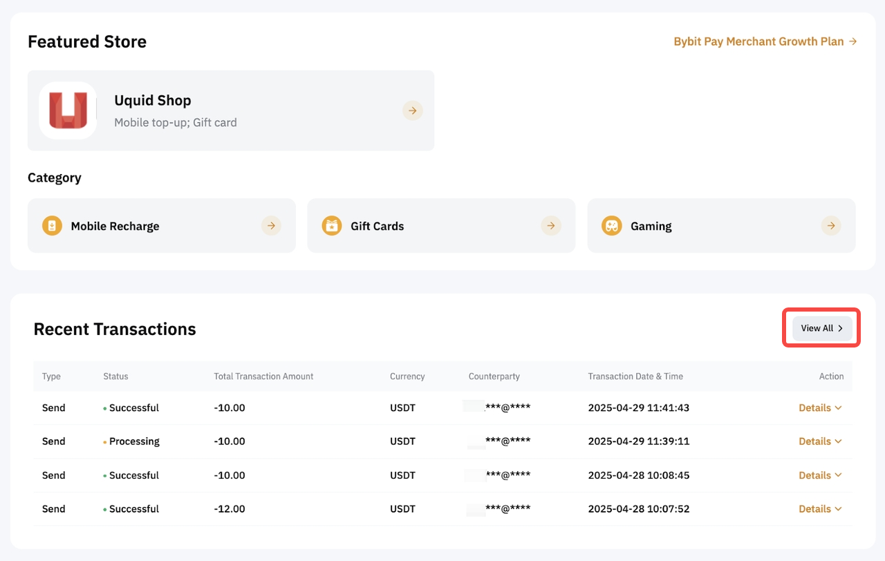لعرض سجل عمليات الدفع، يرجى التوجه إلى صفحة Bybit Pay، قم بالتمرير إلى الأسفل، وانقر عرض الجميع. بدلاً من ذلك، انطلق ببساطة إلى سجل المعاملات</img id="12">.