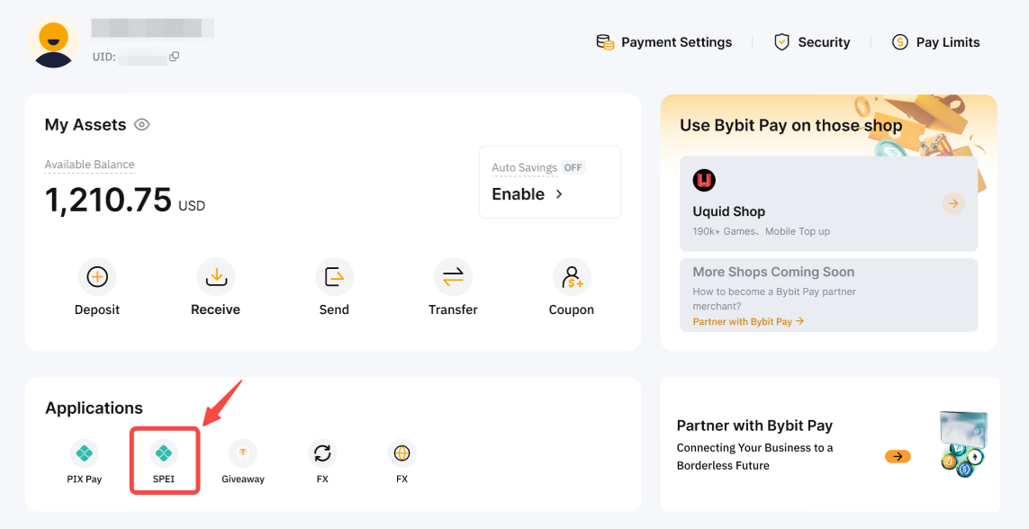 الخطوة 1: انطلق إلى صفحة Bybit Pay بالنقر على المالية → Bybit Pay. ثم انقر على SPEI (لتحويلات SPEI) لفتح واجهة التحويل وبدء التحويل الخاص بك.