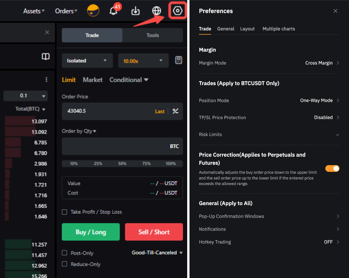 تصحيح السعر | سيقوم تصحيح السعر تلقائيًا بتعديل سعر طلب الشراء إلى الحد الأعلى وسعر طلب البيع إلى الحد الأدنى إذا كانت المبلغ المدخل أقل تفضيلًا من السعر الحالي للسوق. ستظهر نافذة منبثقة لتحذير بالمخاطر لطلب تأكيدك قبل تنفيذ الطلب. الإعداد قابل للتطبيق على كلا العقود الدائمة والمنتهية المدة. |