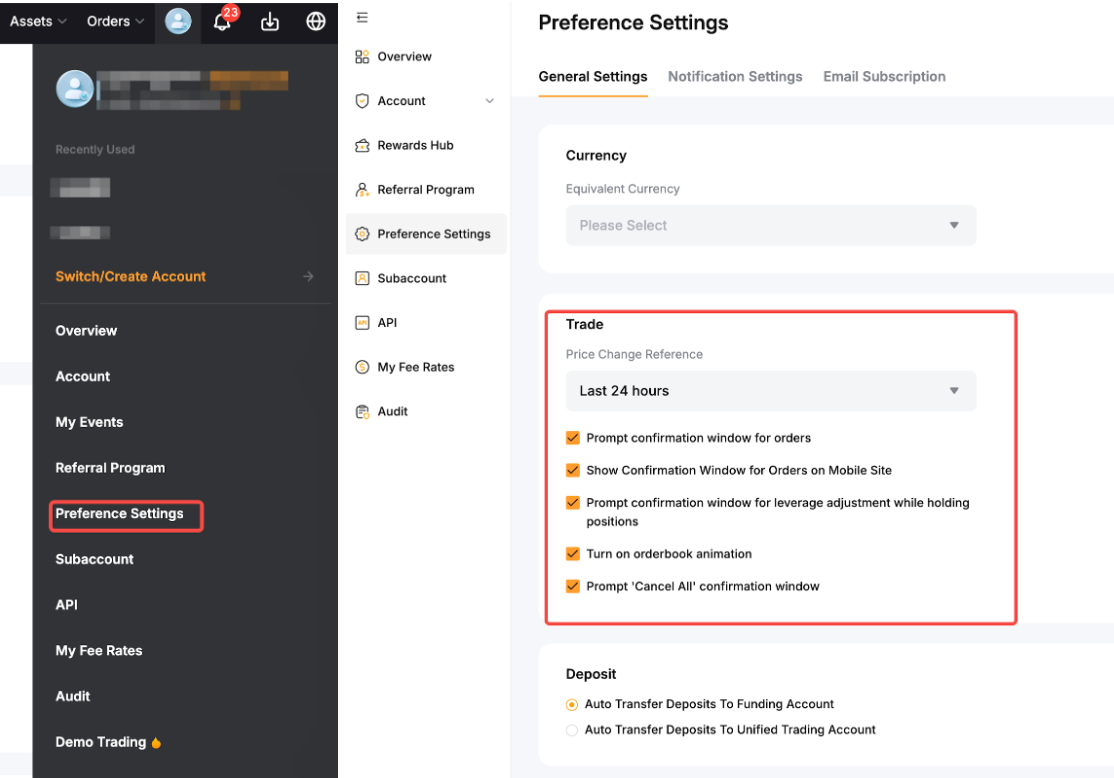 يمكنك الوصول إلى بعض إعدادات التداول ببساطة عن طريق النقر على الصورة الشخصية → إعدادات التفضيل للوصول إلى إعدادات التداول.
