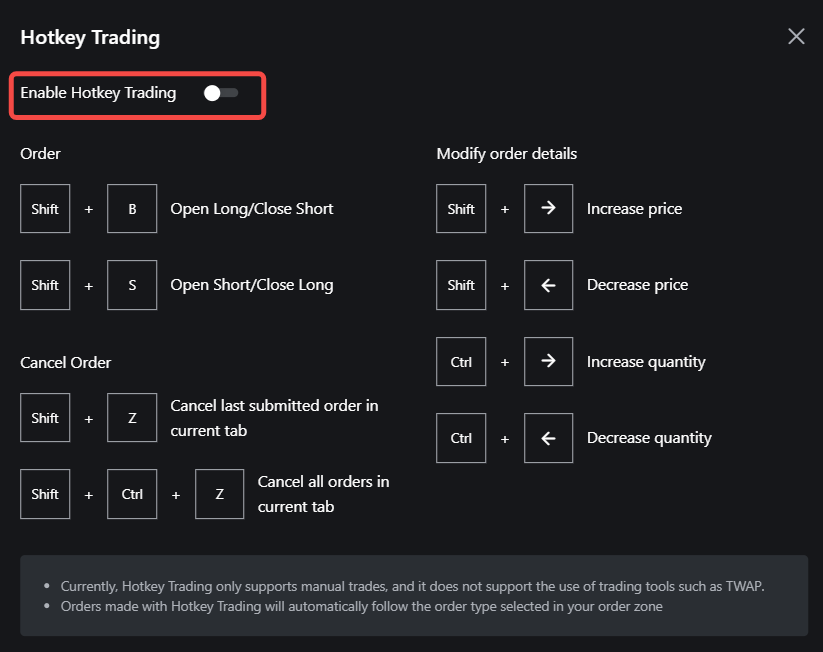 | استخدام التداول باستخدام الاختصارات سيسمح لك بتنفيذ عمليات التداول بسرعة باستخدام اختصارات على لوحة المفاتيح. يرجى الملاحظة أنه في الوقت الحالي، يدعم التداول باستخدام مفتاح الاختصار فقط عمليات التداول اليدوي بنظام السوق، والحدّ، والشرطي، وسوف يتبع نوع الطلب المختار في منطقة الطلب. |