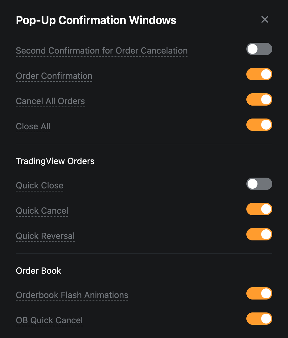توصي Bybit بشدة بتفعيل نوافذ التأكيد على الأقل مثل تأكيد الطلب، عكس سريع، قريب الجميع و إلغاء الكل لتجنب أي إجراءات خاطئة. |