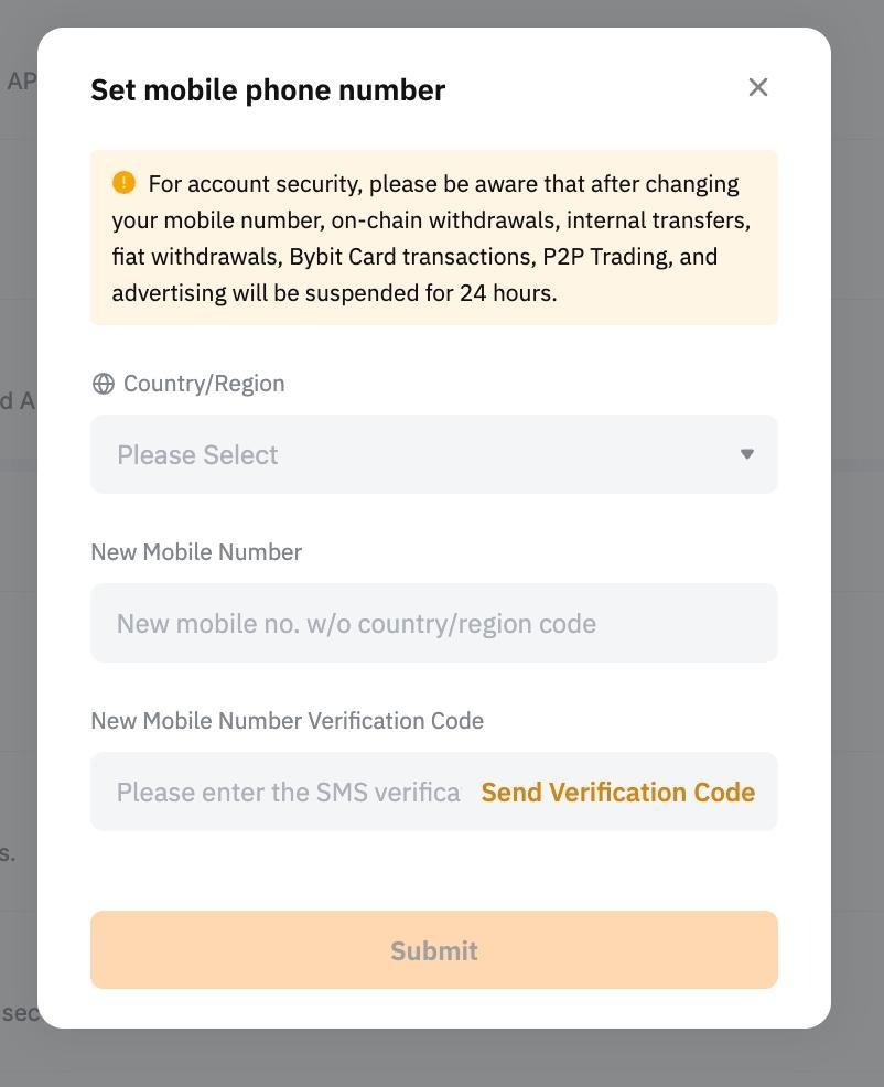 الخطوة 2: ستظهر نافذة تأكيد، تخطرك مسبقًا بأنه سيكون هناك قيود على الخدمات لمدة 24 ساعة لسحب العملات الرقمية والفيات، التحويلات الداخلية، معاملات بطاقة Bybit، التداولات والإعلانات على P2P بعد تغيير رقم هاتفك المحمول. بمجرد فهمك، اضغط على تغيير الهاتف المحمول للمتابعة.