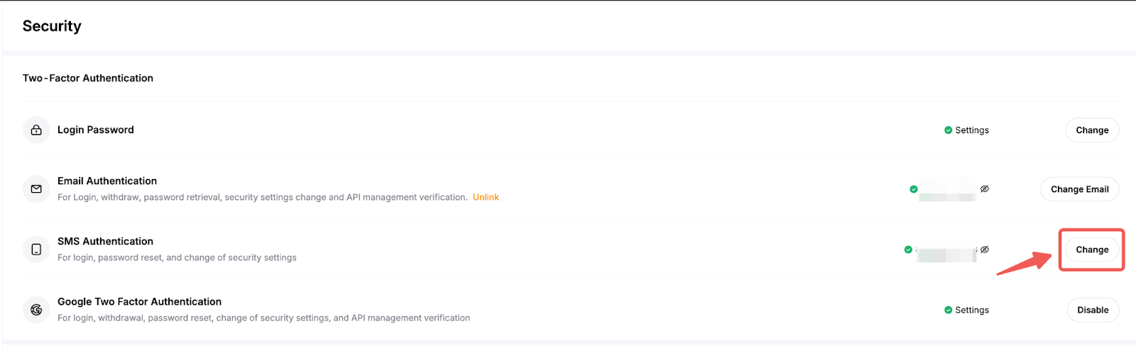 الخطوة 1: انتقل إلى صفحة الأمن واضغط على زر الإعدادات، تحت المصادقة عبر الرسائل القصيرة، كما هو موضح أدناه.