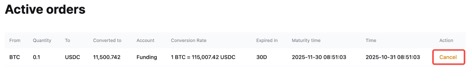 — الأوامر المحددة الموضوعة عبر التحويل صالحة لمدة 30 يومًا. سيتم حجز الأصول المعنية حتى يتم تنفيذ الأمر أو ينتهي. إذا لم يتم تنفيذ الأمر خلال 30 يومًا، فسيتم إلغائه تلقائيًا.