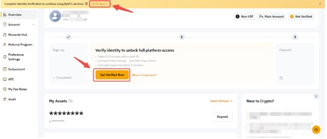 لقد قمت بالتسجيل بنجاح على منصة Bybit! سيتم نقلك إلى صفحة لوحة التحكم في حسابك حيث يمكنك البدء في إكمال التحقق من الهوية للوصول إلى جميع منتجات وخدمات Bybit.