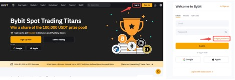 الخطوة 1: على الصفحة الرئيسية لـ Bybit، انقر على تسجيل الدخول. بمجرد الوصول إلى صفحة تسجيل الدخول، اضغط على نسيت كلمة المرور.