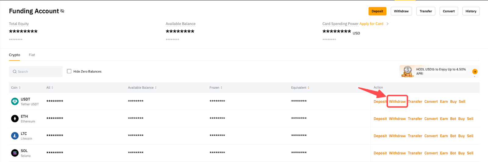وبدلاً من ذلك، انتقل إلى حساب التمويل وانقر فوق زر السحب في عمود العملة التي ترغب في سحبها.