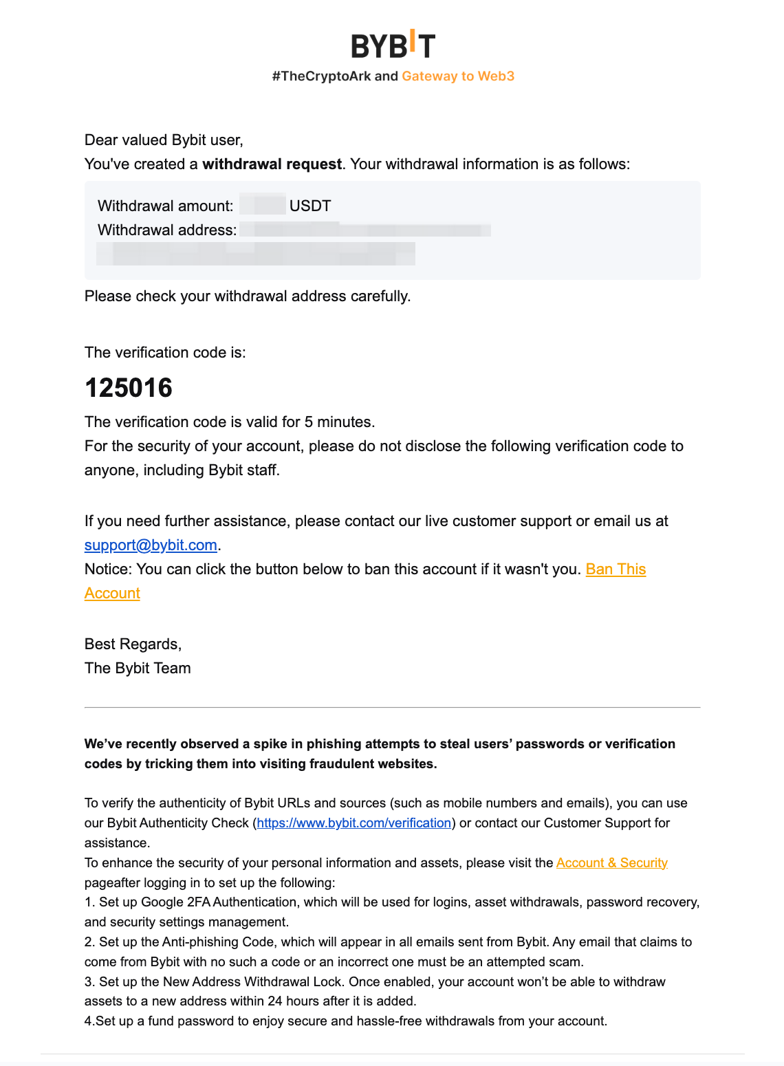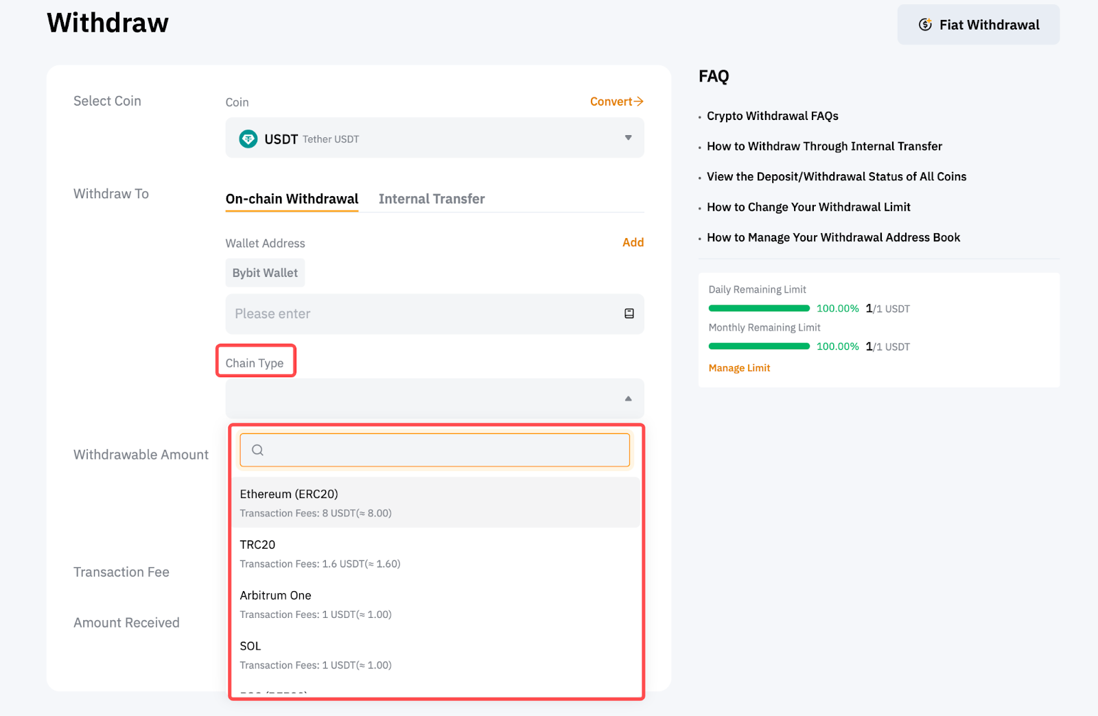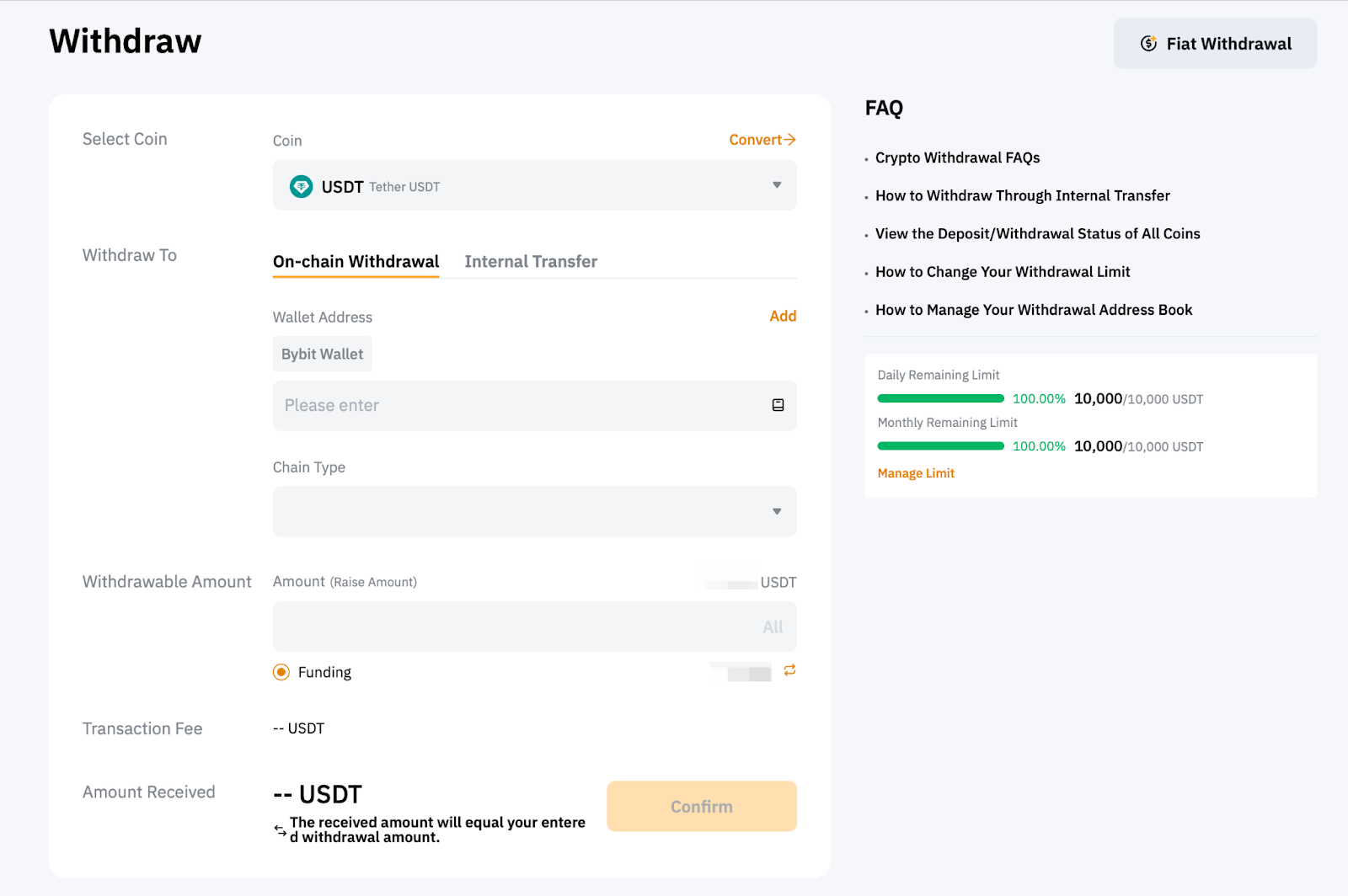 — يدعم Bybit السحب الفوري. يعتمد وقت التأكيد على سلسلة الكتل وحركة مرور الشبكة الحالية. لمزيد من المعلومات، يُرجى الرجوع إلى الأسئلة الشائعة - السحب من العملات المشفرة.