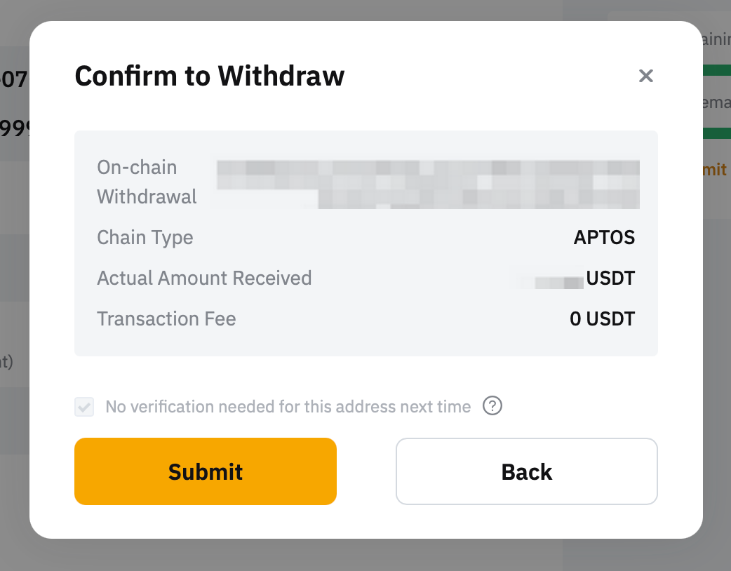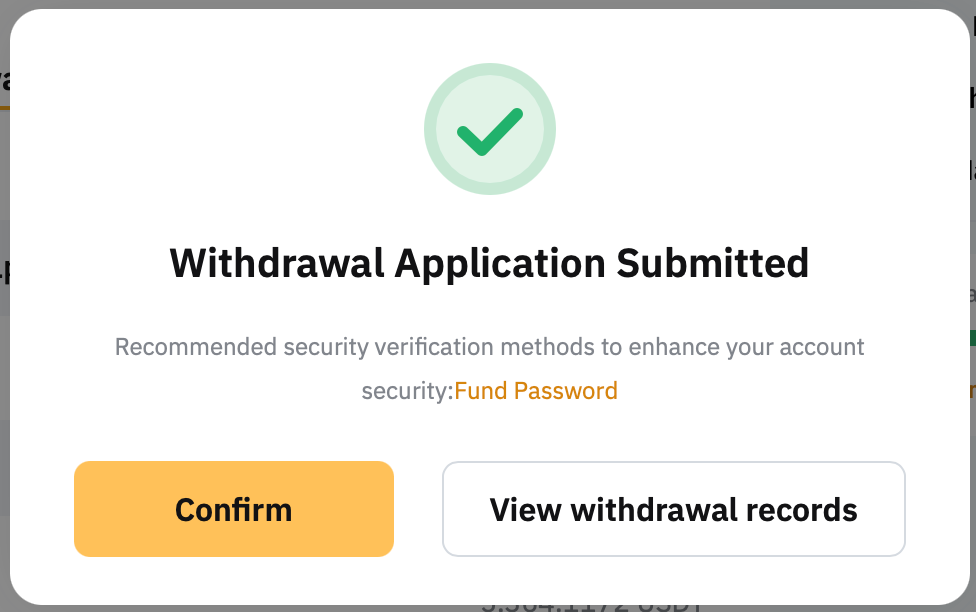 إذا تم التحقق من عنوانك في القائمة البيضاء لعنوان السحب، فلن تحتاج إلى إجراء عملية التحقق من 2FA، ويمكنك إرسال طلب السحب كما هو موضح أدناه. للتحقق من عنوان محفظة السحب، يمكنك اتباع هذا الدليل.
