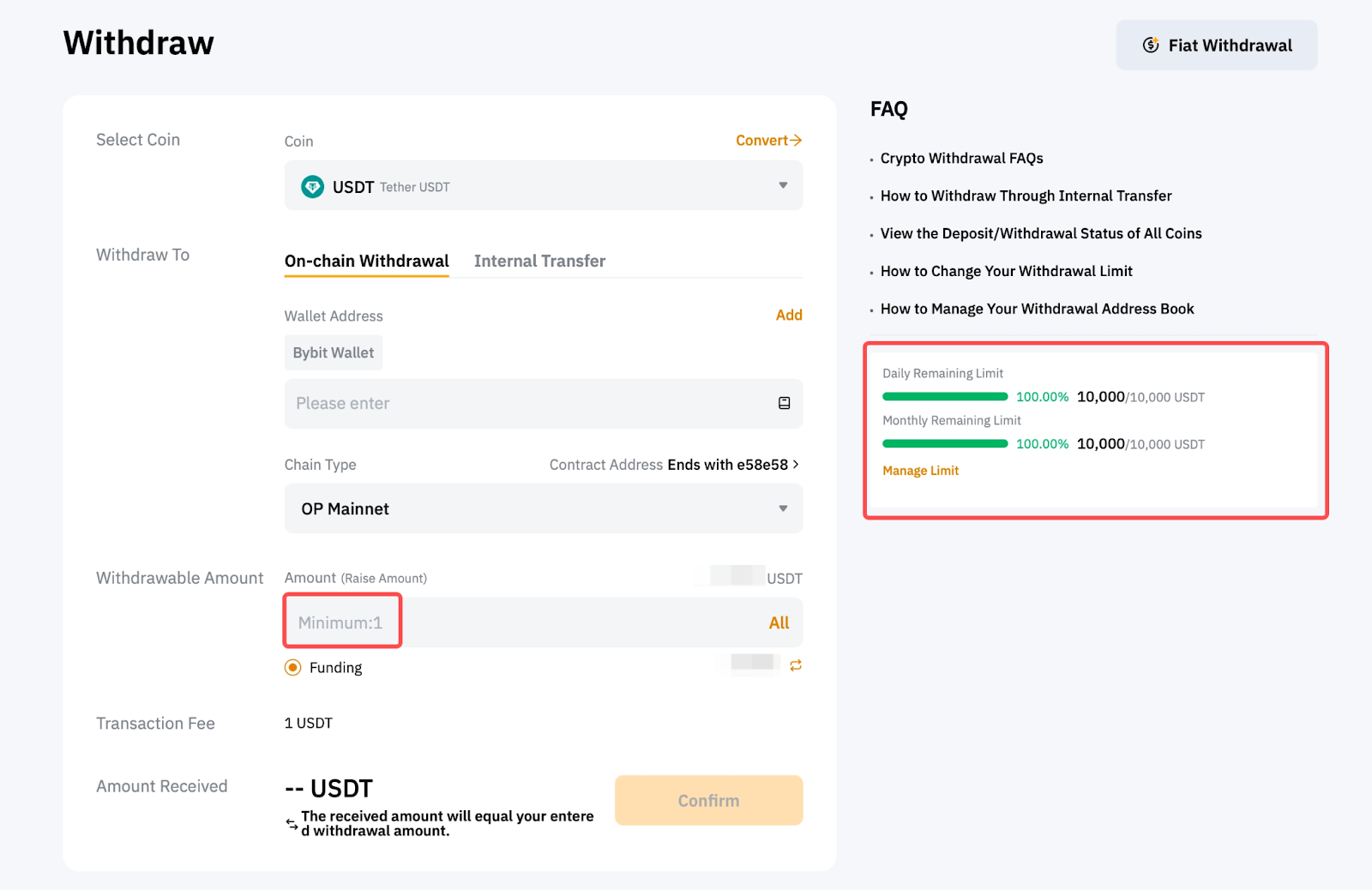 الخطوة 4: أدخل المبلغ الذي تريد سحبه، أو انقر فوق الكل لإجراء عملية سحب كاملة. بمجرد تحديد نوع السلسلة، ستتم الإشارة إلى الحد الأدنى للسحب لهذه العملة وشبكة سلسلة الكتل في حقل الكمية القابلة للسحب. ستجد أيضًا الحدود اليومية والشهرية المتبقية للانسحاب على الجانب الأيمن من الصفحة. لتغيير حد السحب الخاص بك، اتبع الدليل هنا.