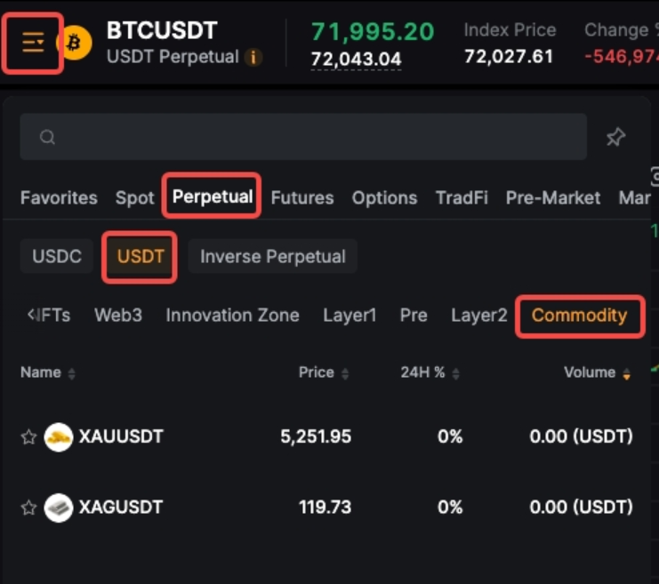 في صفحة تداول العقود الآجلة، افتح قائمة الرموز المنسدلة في الزاوية العلوية اليسرى وانتقل إلى دائم → USDT → سلعة.