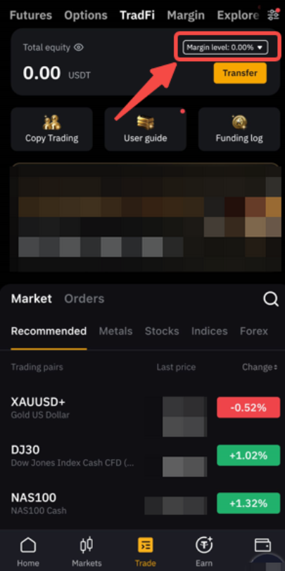 Margin Level for TradFi (MT5) within the Bybit mobile app can be found at the Trades tab seen below.