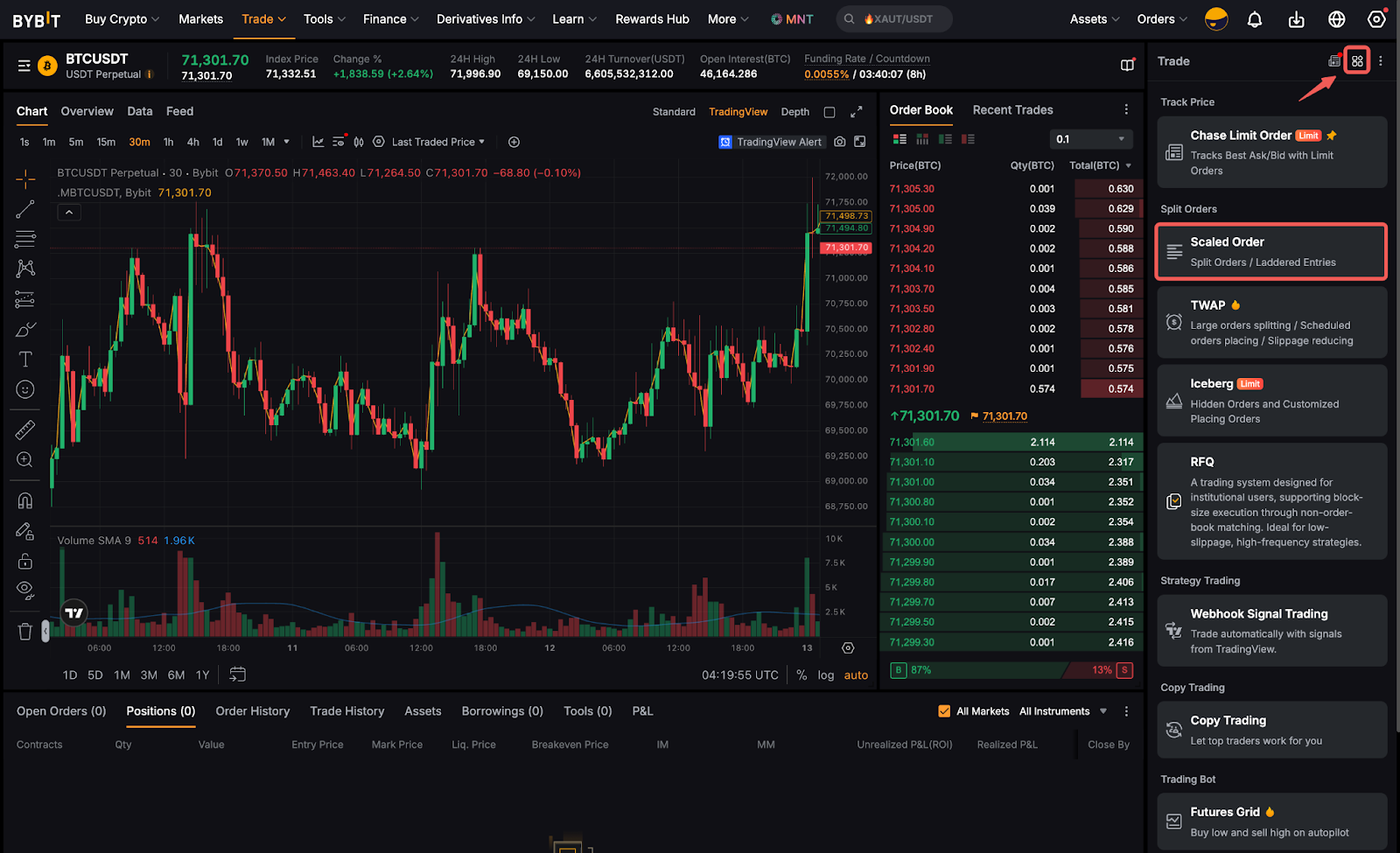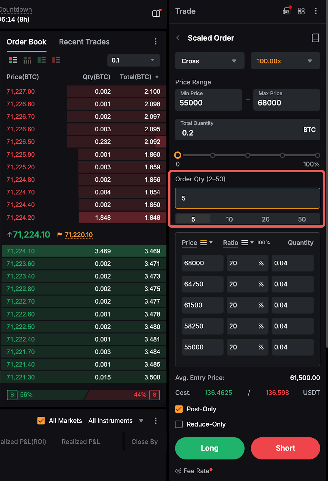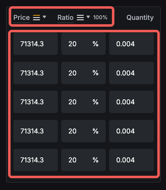يرجى ملاحظة أن الكمية الإجمالية الدنيا والقصوى لأوامر التدرج هي 10 أضعاف الحد الأدنى والحد الأقصى لحجم الأمر. على سبيل المثال، الحد الأدنى والحد الأقصى لحجم الأمر لـ BTCUSDT هما 0.001 BTC و 100 BTC على التوالي. وبالتالي، فإن الكمية الإجمالية الدنيا والقصوى لأمر التدرج ستكون 0.01 BTC و 1000 BTC على التوالي.