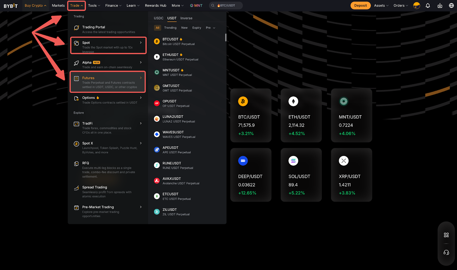 الخطوة 1: على الصفحة الرئيسية لـ Bybit، انتقل إلى قائمة التداول المنسدلة واختر إما التداول الفوري أو التداول بالعقود الآجلة. ثم، اختر العقد الذي ترغب في تداوله.