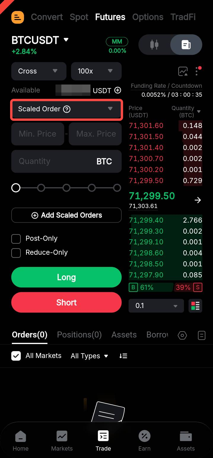 على التطبيق، اذهب إلى علامة التبويب التداول. اضغط على قائمة نوع الأوامر المنسدلة، اختر أوامر التدرج، وأدخل نطاق السعر المفضل لديك (النطاق العلوي والسفلي لأمر التدرج الخاص بك) و الكمية لأمر التدرج الخاص بك.