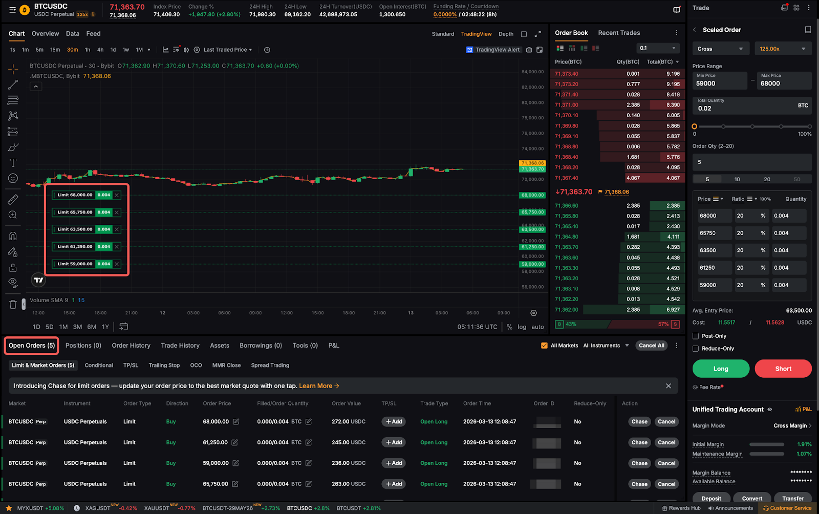 بعد تقديم طلب متدرج بنجاح، سيتم تحديث الرسم البياني الخاص بك ليعكس طلبك المتدرج عند تغييرات السعر المختلفة وفقًا لذلك. يمكنك التحقق من طلبك المحدود المقدم من علامة التبويب الأوامر المفتوحة .
