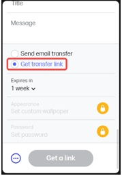 الخطوة 2: اختر الحصول على رابط النقل، ارفع ملفك، وانقر على الحصول على رابط. يمكنك أيضًا تضمين رسالة إلى فريقنا إذا لزم الأمر.