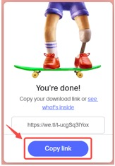 الخطوة 3: بعد اكتمال النقل، سترى رابط النقل الخاص بك. انقر على زر نسخ الرابط الأزرق والصقه في ردك على بريدنا الإلكتروني أو أدخله في صندوق وصف النموذج عند تقديم طلبك.