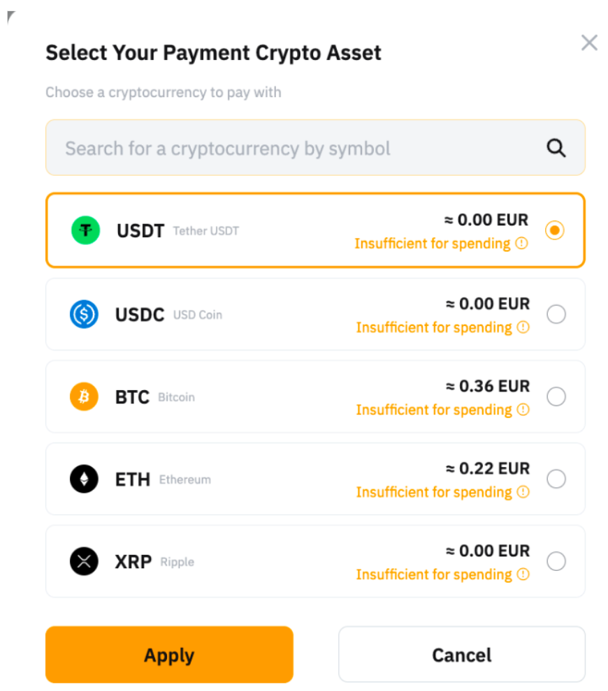 You can select up to 3 types of payment crypto for your Bybit Card transactions and the default payment priority is USDT > USDC > BTC. However, you can manage your spending currencies, including adding, removing, or changing the order on the Card Dashboard page.