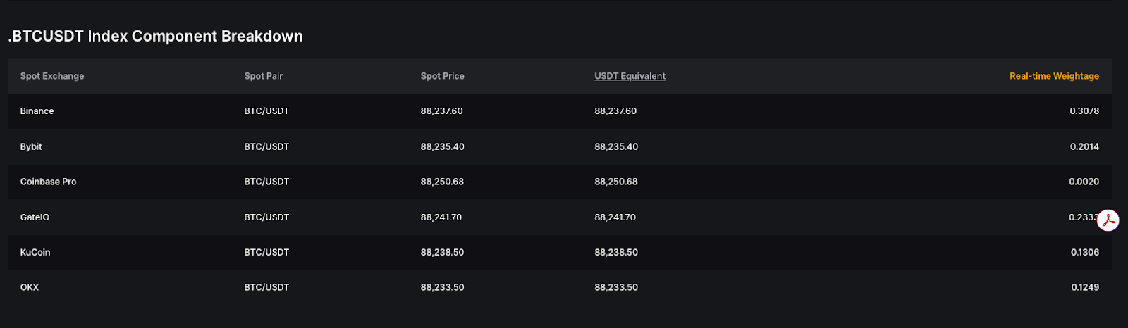 The index price depends on three (3) variables: Spot Price, USDT-Paired Equivalent and Real-time Weight.