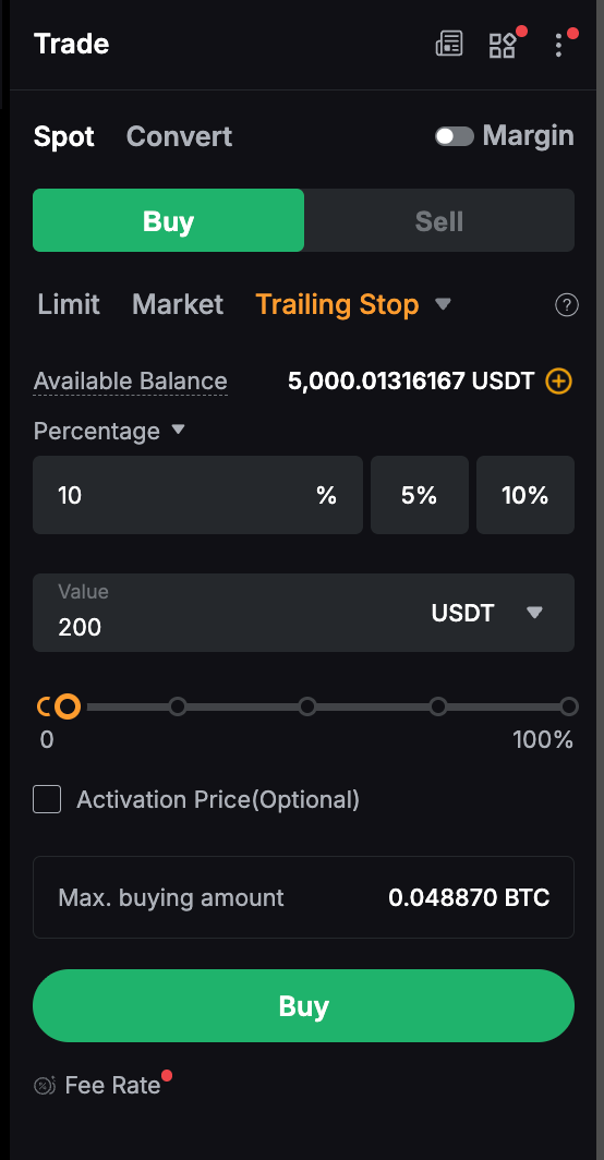 Trailing Stop in Spot and Margin trading is a dynamic order type that functions as an enhanced feature for Buy and Sell. It operates as a stop order that tracks the market price of an asset or position and automatically adjusts the stop order to minimize loss or lock in profits as the price moves in the trader's favor. Once the Trailing Stop is determined, if the market price reaches a certain level and then retraces back by a predetermined amount set by the user, a market order will be triggered.