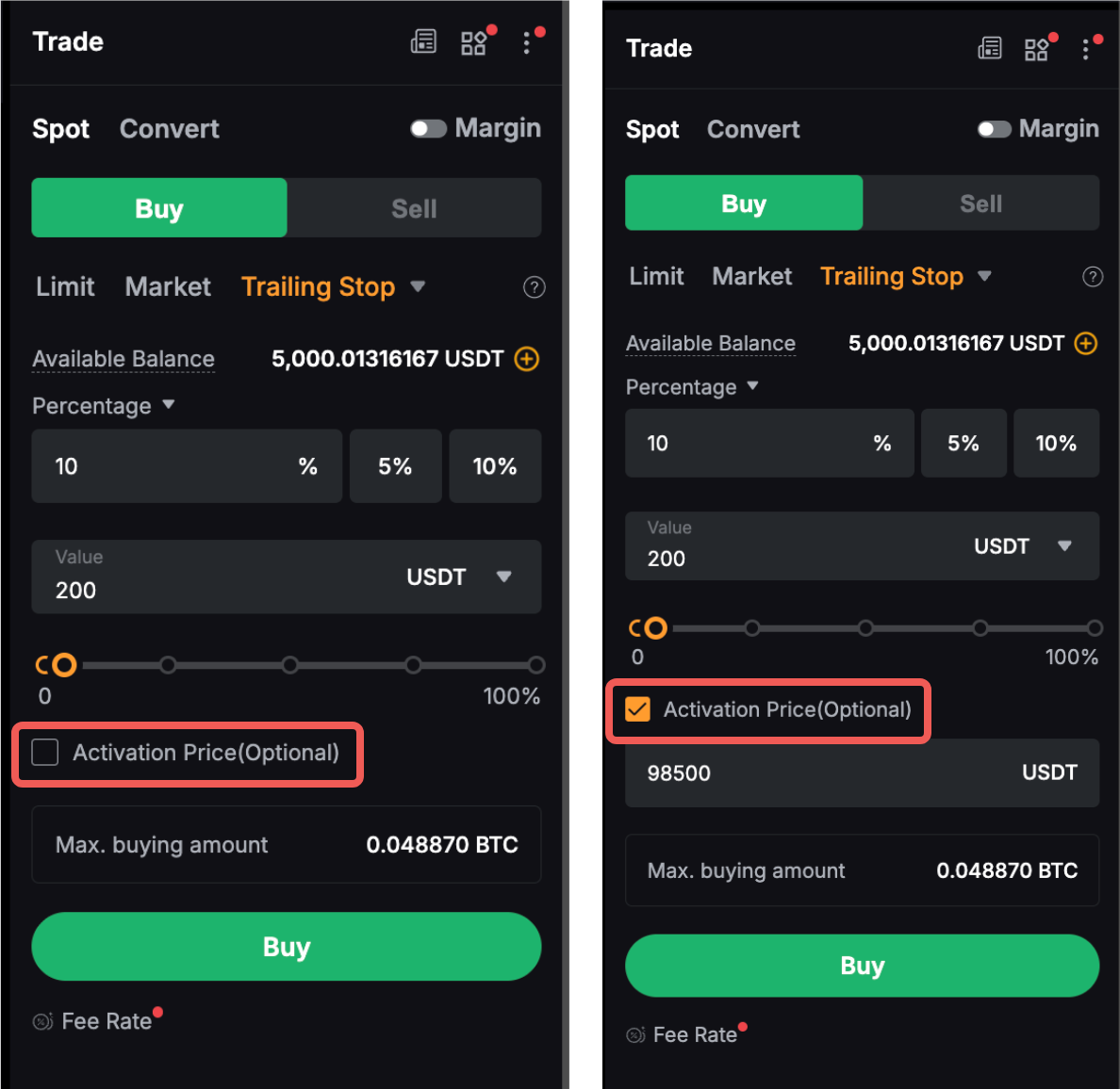 - By Rate (or Percentage): Price retracement in terms of percentage from the best price recorded since activation.