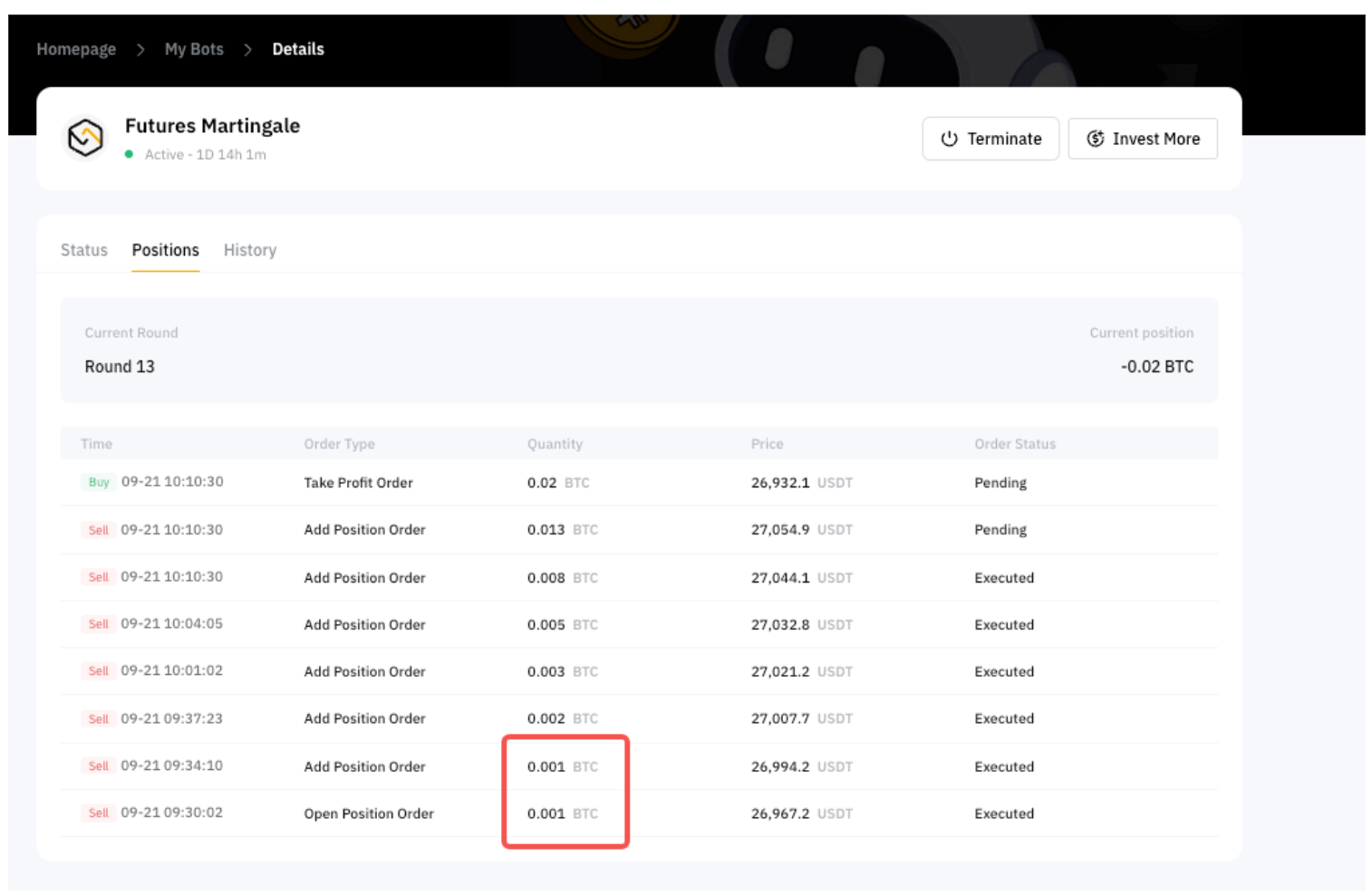 Cuando se ejecuta el bot de futuros de Martingale, los beneficios permanecerán dentro del bot, pero no se utilizarán como margen para la siguiente ronda de trading. Los fondos se transferirán automáticamente de la cuenta de Trading Bot del usuario a la cuenta de financiación después de que finalice la estrategia de bot Martingale.