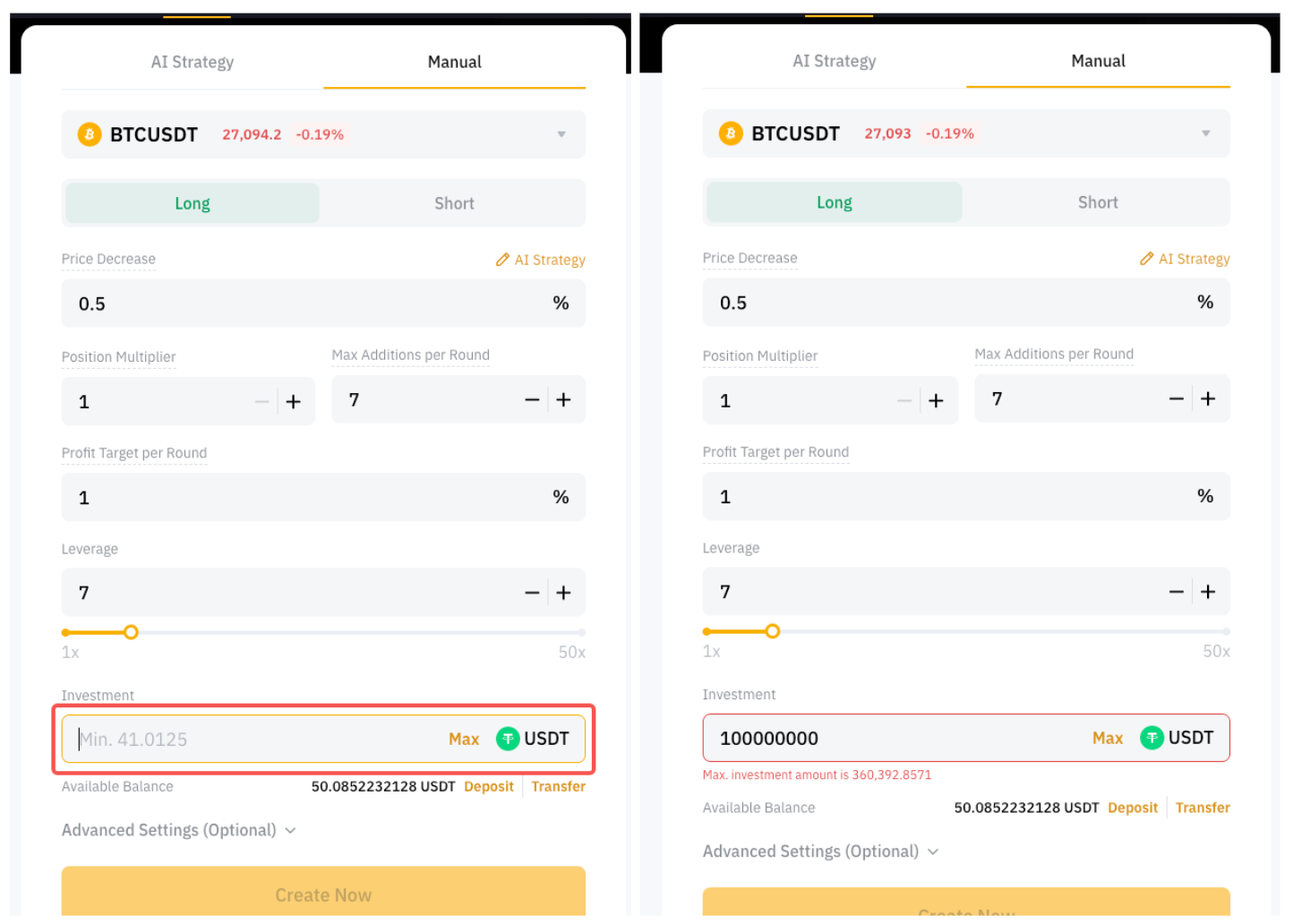 - No tienes suficientes activos USDT en tu cuenta de financiación para cumplir satisfacer la cantidad de inversión mínima para tus estrategias de bot de futuros Martingale