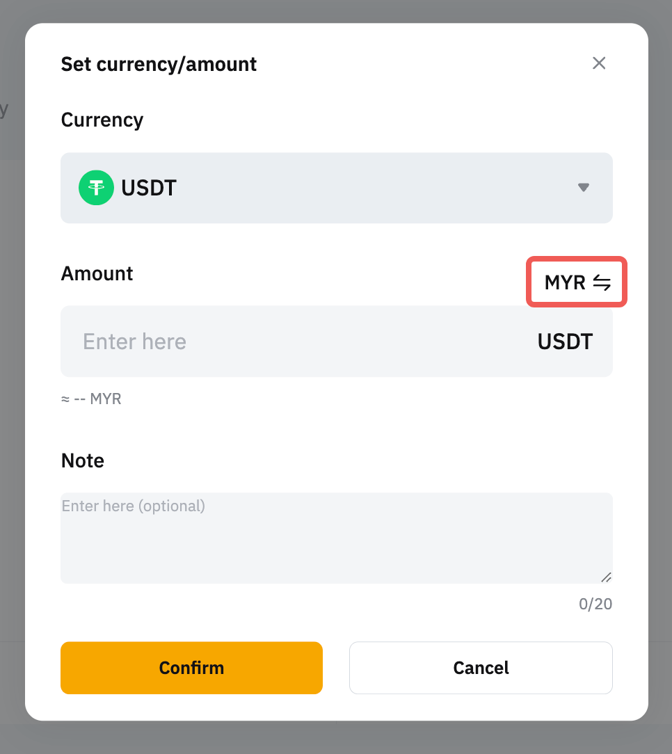 QRコードを共有する前に、仮想通貨の種類と金額を設定し、メモを含めることができます。また、スワップアイコンをクリックして法定通貨の金額を入力すると、自動的に計算された同等の暗号資産額が表示されます。