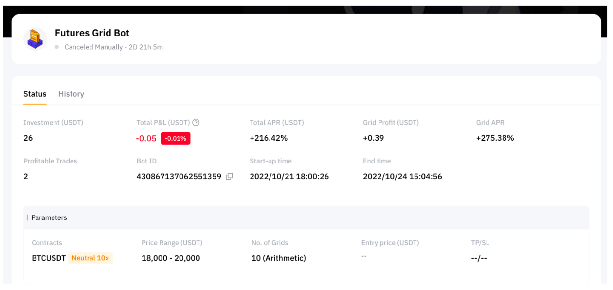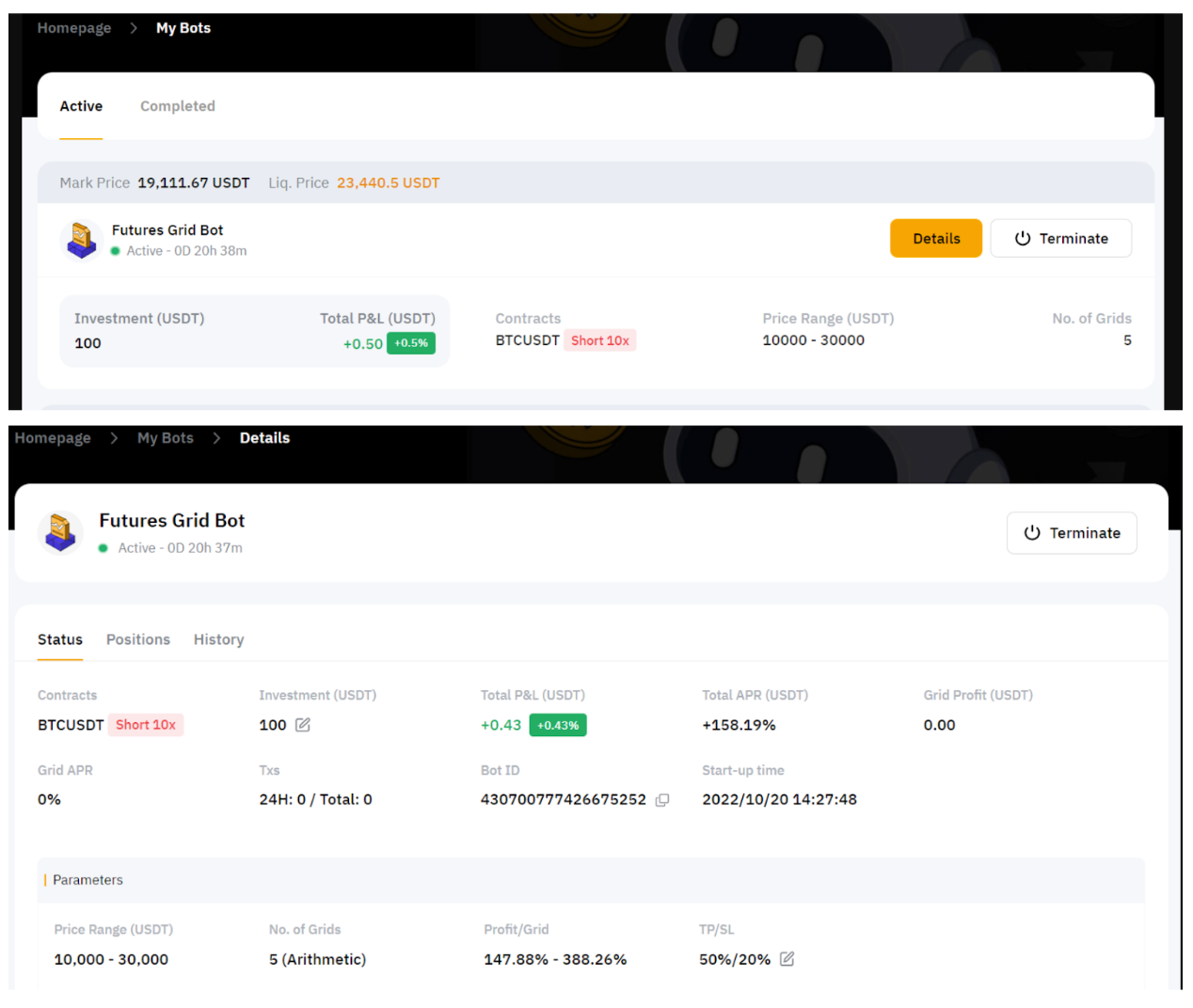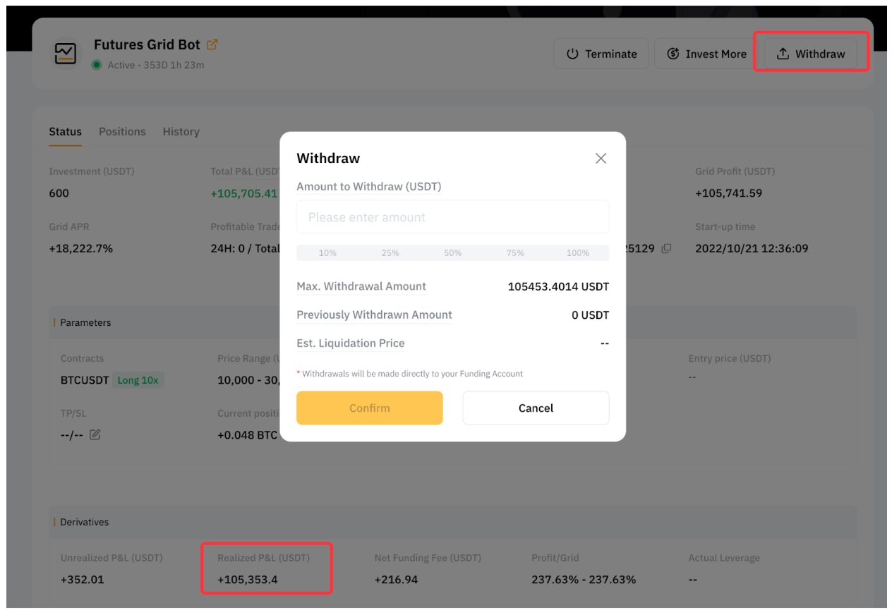 All trading bots will be channeled directly through the Funding Account. When you create a Futures Grid Bot, the system will automatically transfer the investment amount from your Funding Account to the Trading Bot. Upon termination of the bot, the investment amount and profits (if any) will be transferred back to your Funding Account.
